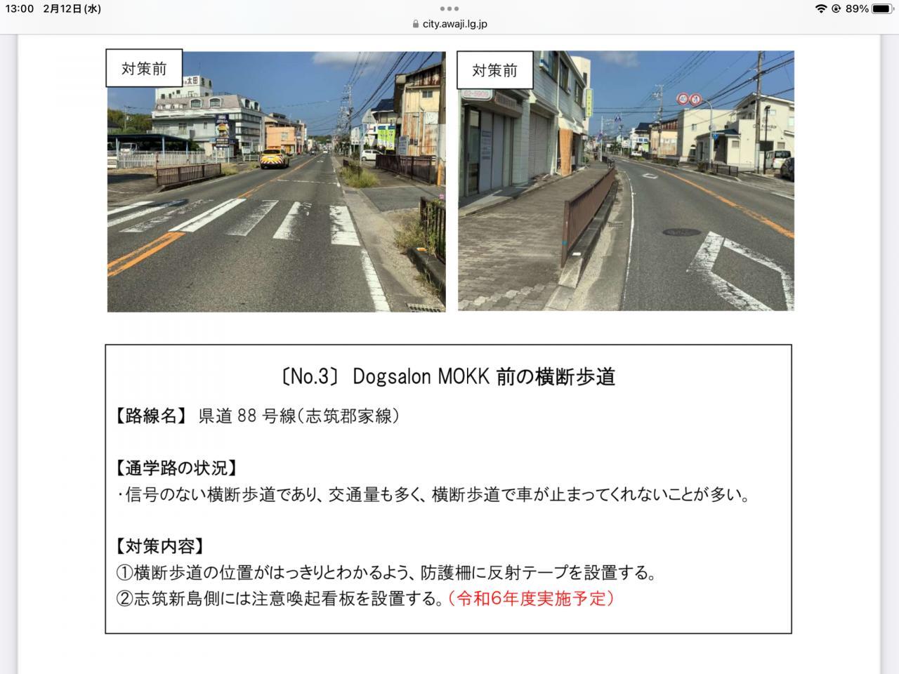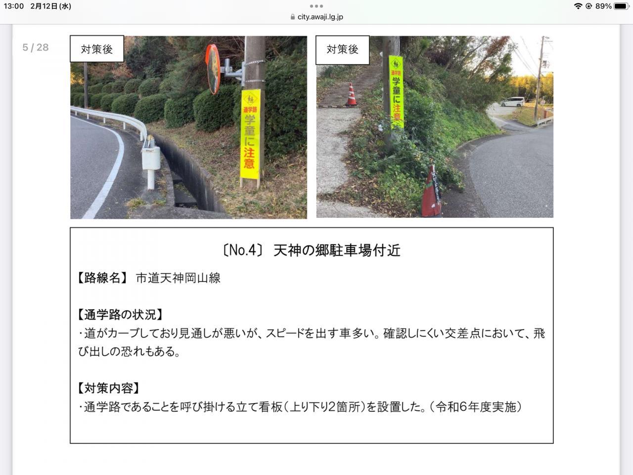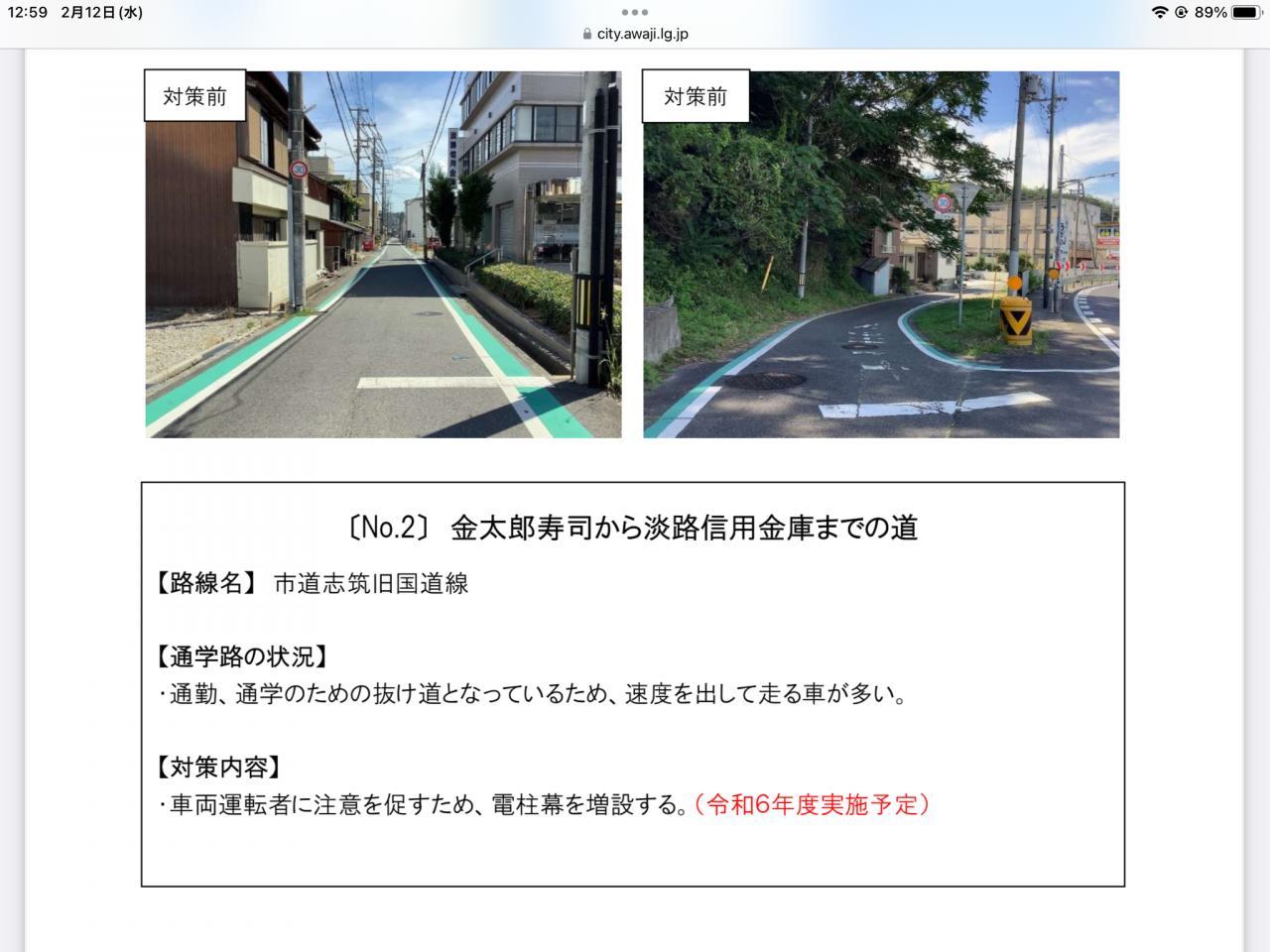 ●通学路調査ではたいへんお世話になりました。志筑地区は対策予定箇所、対策実施箇所として対策を3か所していただいています。令和6年度淡路市通学路合同点検対策として淡路市HPにも対策一覧表や対策箇所図等が記載されています。引き続き、児童や地域住民の方の安全確保のため、交通安全へのご協力をお願いいたします。