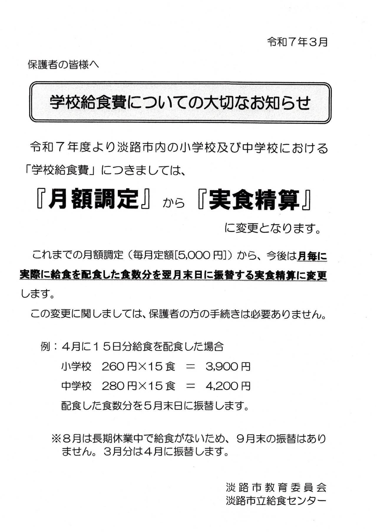●本日、お子様を通じて「学校給食費についての大切なお知らせ」を配布しております。令和7年度より淡路市内の小学校及び中学校における「学校給食費」については「月額」から実際に給食を配食した食数分を翌月末日に振替することになります。変更にご注意ください。