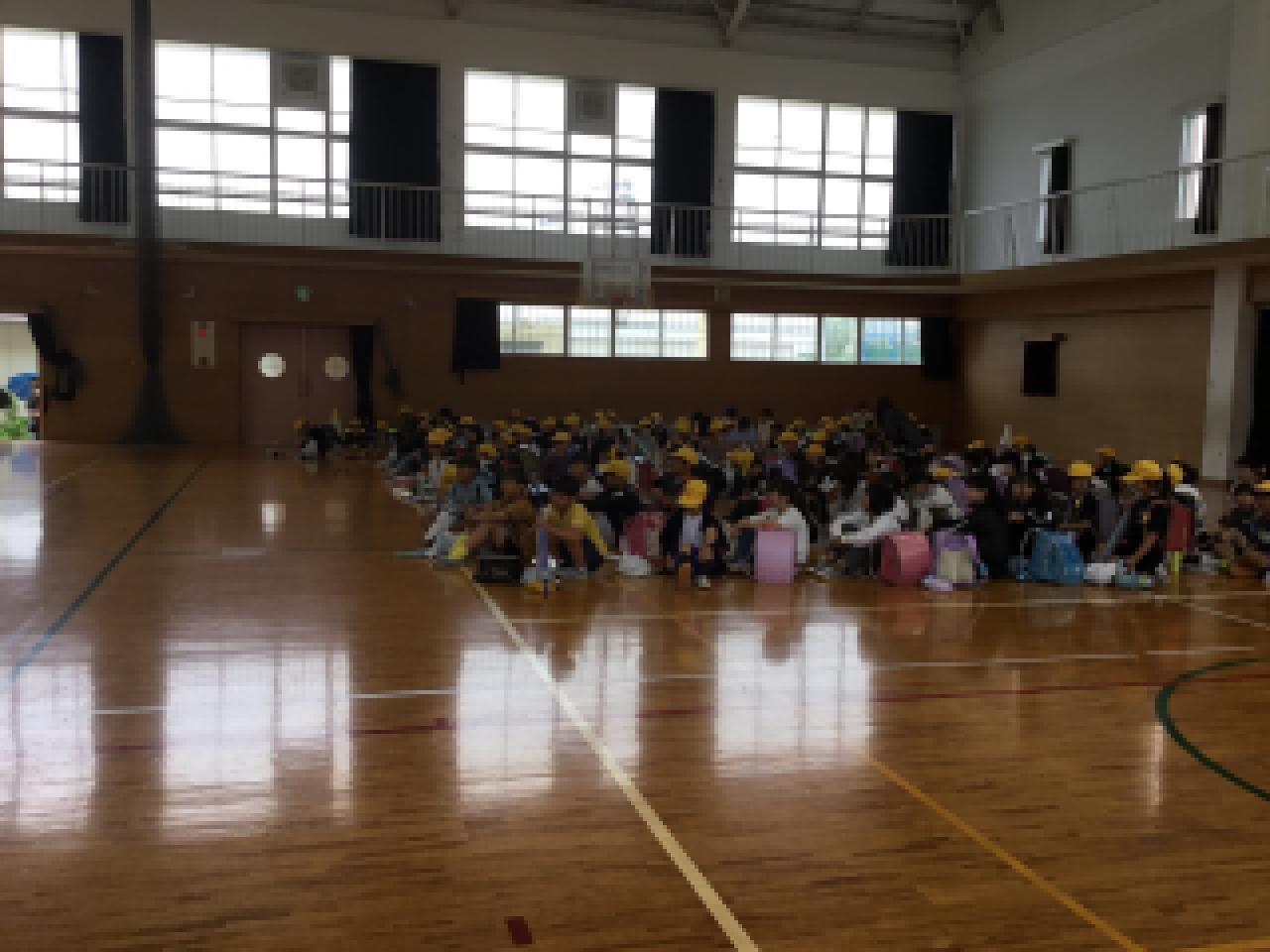 ●体育館では、児童が地区ごとにわかれ、お迎えの呼び出しがあるのを待ちます。警報がでた場合や引渡しが必要な場合、職員は、運動場・体育館・教室(後半の地区)に分かれ、引渡しを行います。