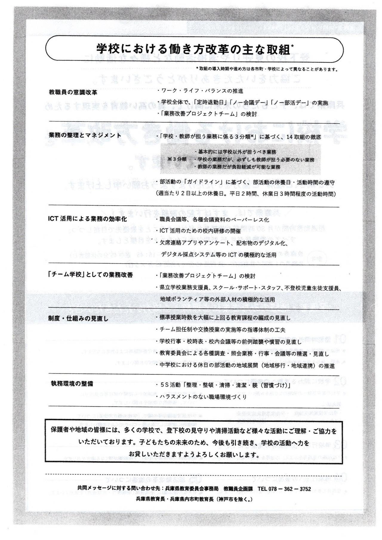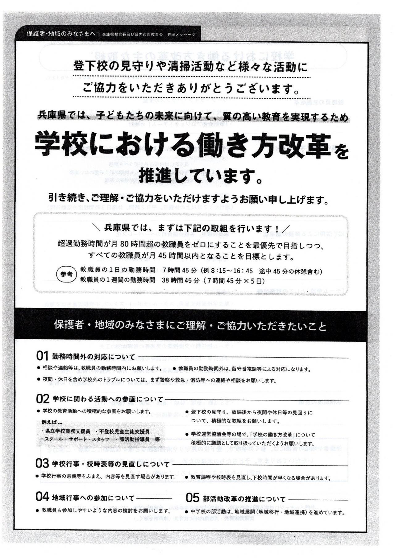● 兵庫県教育委員会は「共同メッセージ」により教職員の働き方改革を推進しています。保護者・地域のみなさまのご理解・ご協力をお願いいたします。