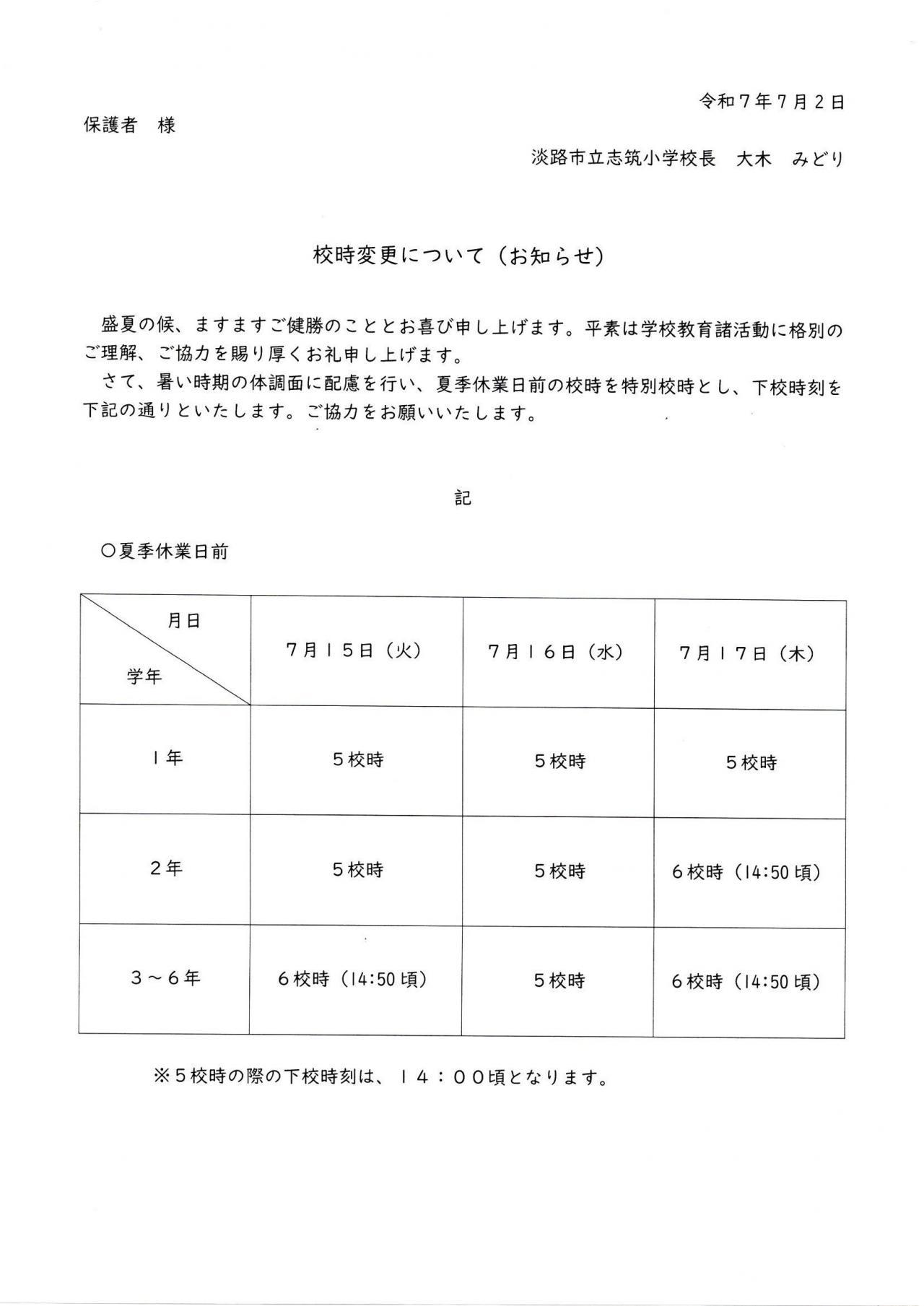 ●7月15日(火)、16日(水)、17日(木)は校時の変更を行います。本日、配布の校時変更のお知らせをご覧いただき、ご対応をお願いいたします。5校時の下校は14:00ごろ、6校時の下校は14:50ごろになります。暑い時間帯での下校になります。暑さ対策について、ご家庭でもお子様とじゅうぶんご相談ください。