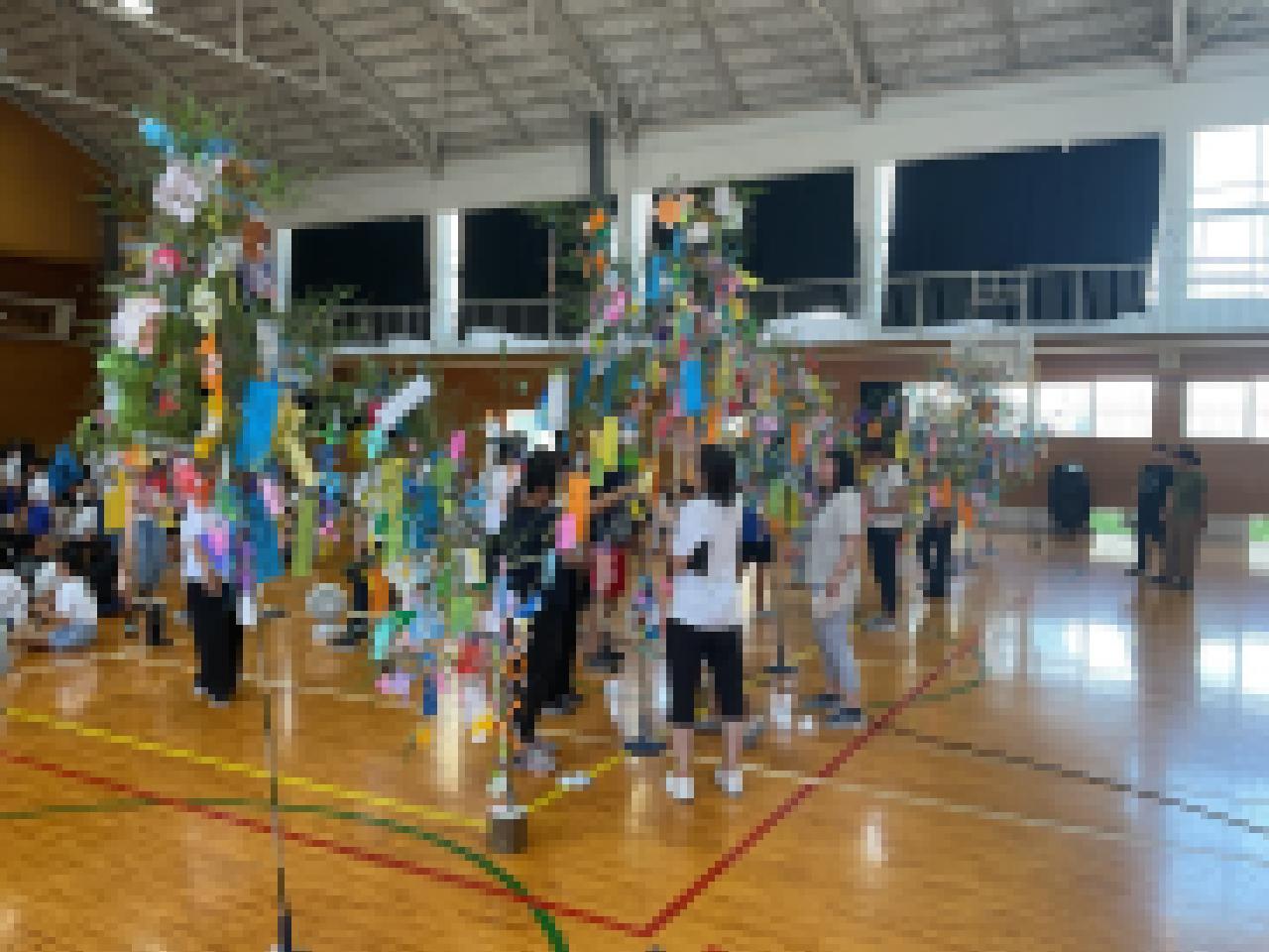 ●7月の七夕の日には、たんざくに願いごとを書いたり、笹に飾りつけをしたり、楽しい「七夕集会」が行われ、立て割班ごとに交流することができました。