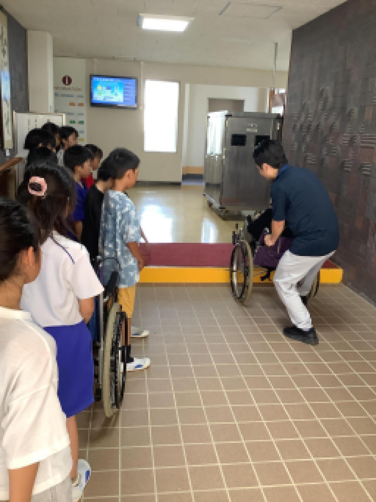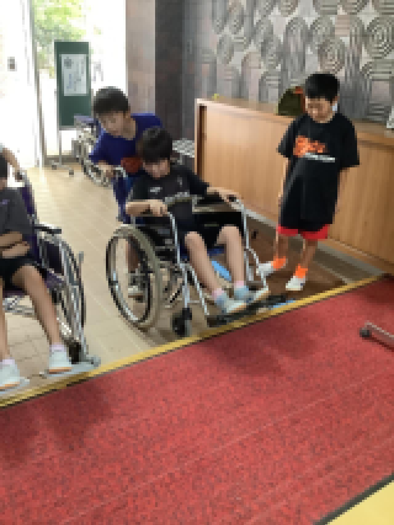 ●同日、4年生は総合的な学習で「福祉体験学習:車いす体験」をしました。暑い中、社会福祉協議会の方やボランティアの方に車いすの乗り方や押し方を教えていただきました。