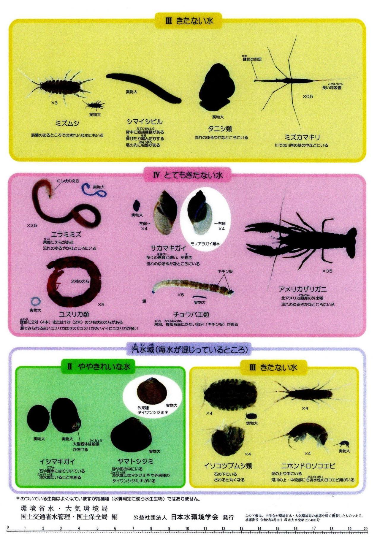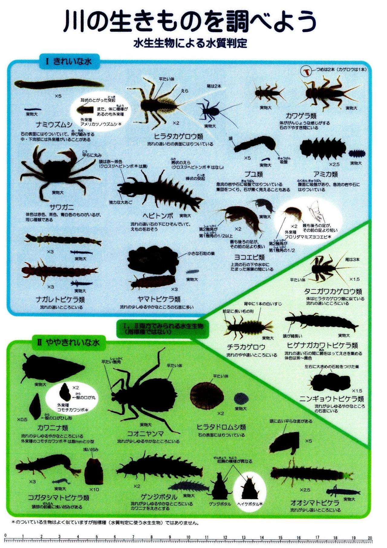 ●生き物探検の結果によると、宝珠川は、Ⅰきれいな水、Ⅱややきれいな水、Ⅲきたない水、Ⅳとてもきたない水、のどの指標にも生き物が生息する多様性にとんだ元気な川ということがわかりました。どの指標の生き物も共生できる多様性のある環境の宝珠川が何かうれしい気がしました。