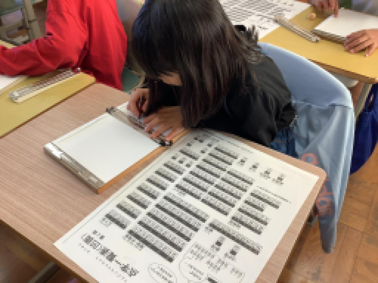 ●10月23日(木)、4年生は福祉体験学習で点字を学びました。車いす体験、点字体験など、福祉学習も深まっています。