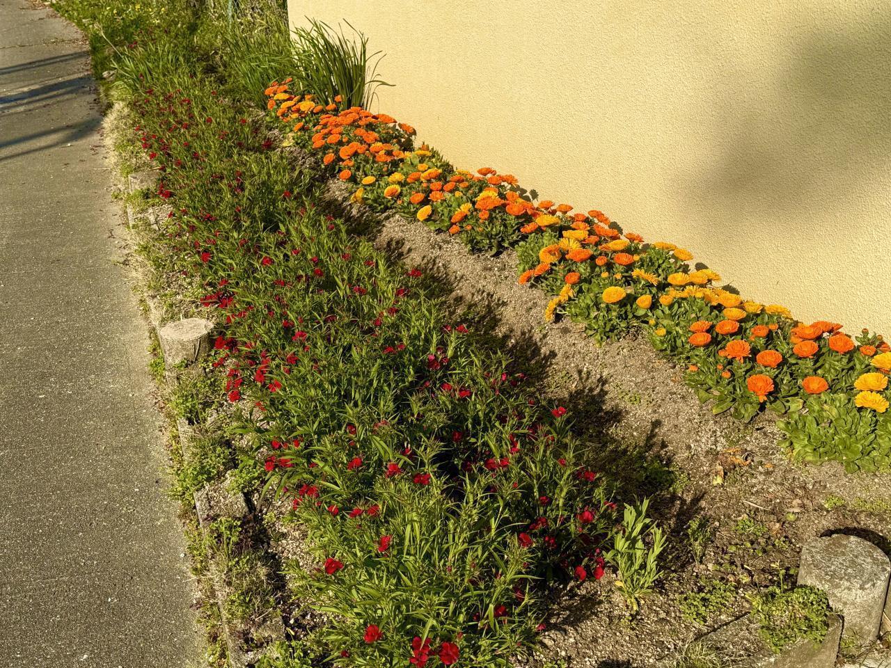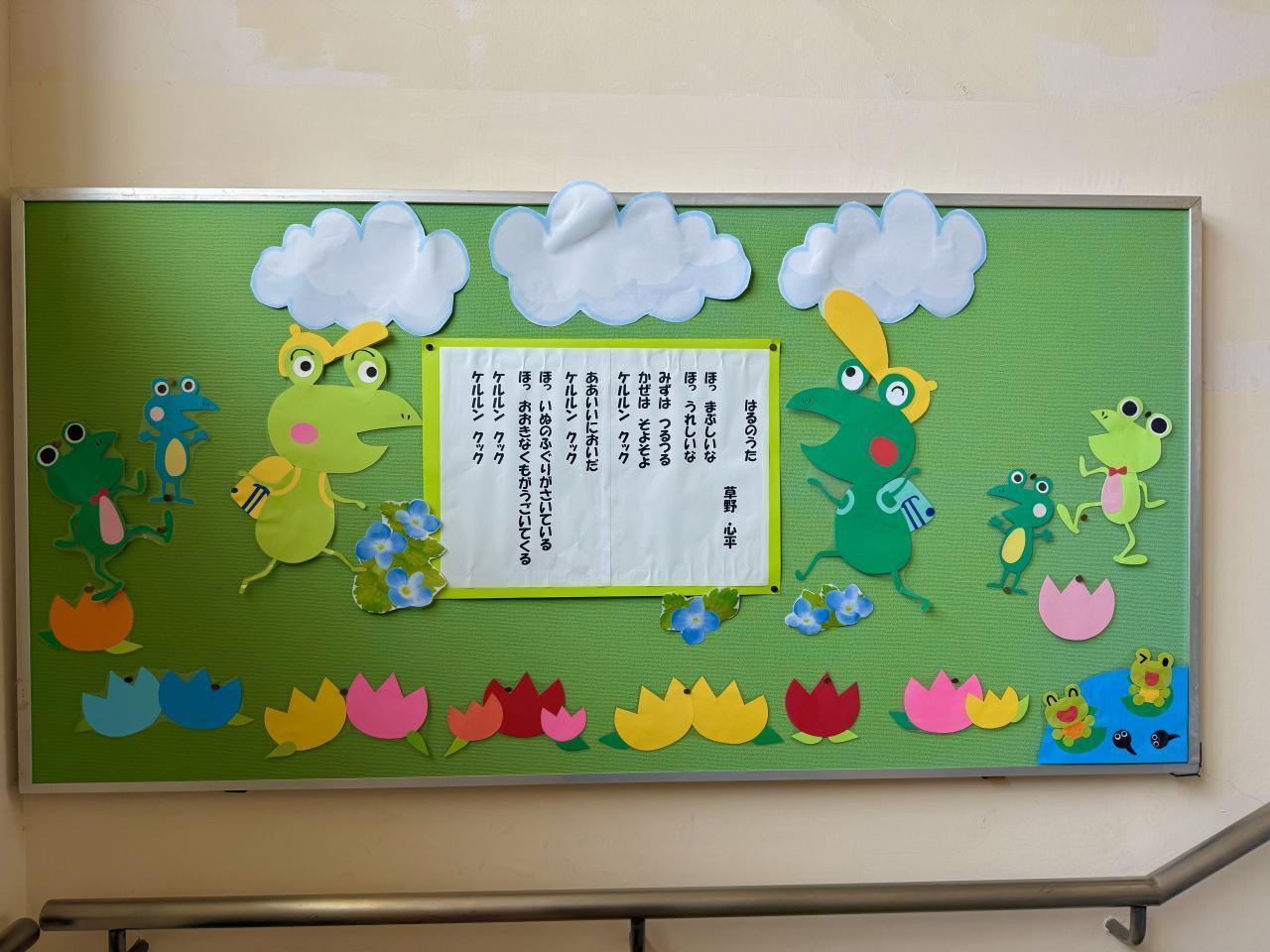 春らしいぽかぽか陽気の一日でした。校庭のお花も良い感じで咲いています。掲示物も華やかで、4年生が勉強している「春の歌」が飾られていました。