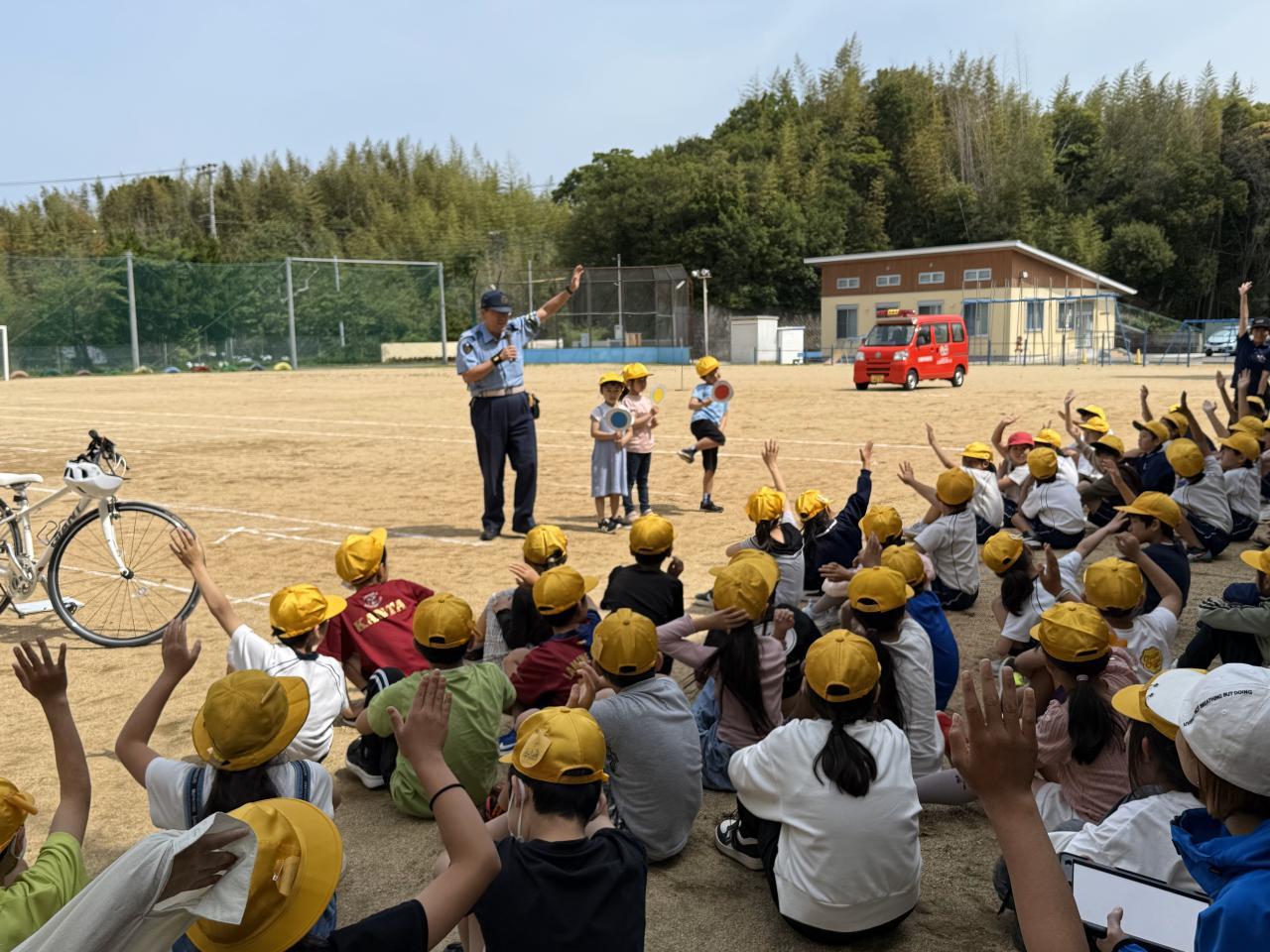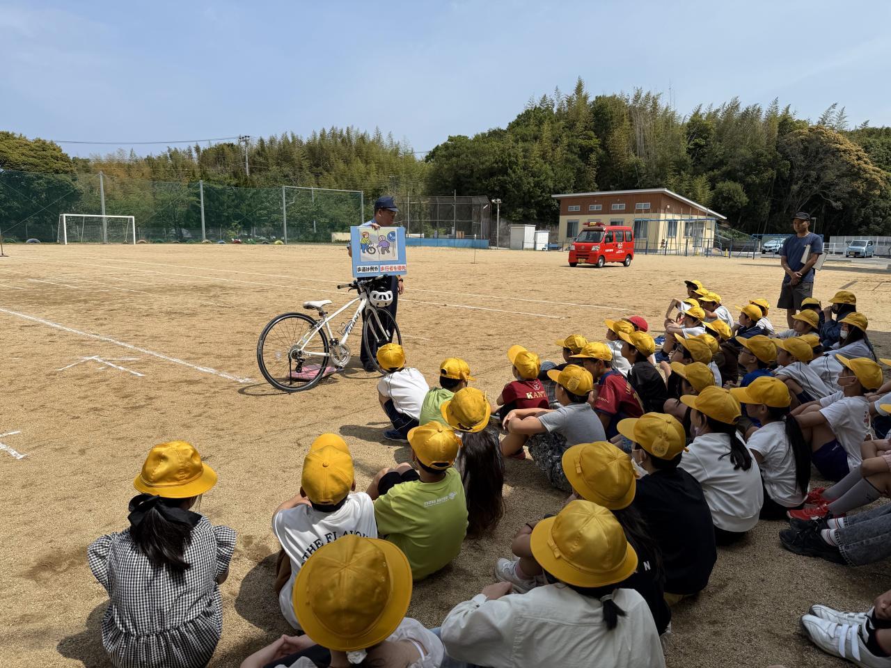 安全教室では、信号の見方や横断歩道の渡り方、死角の危険性について実演を交えた説明があり、子どもたちは真剣な表情で聞いていました。また、自転車に乗る際のヘルメット着用の大切さや、夜間に目立つ服装の必要性についても強調されました。