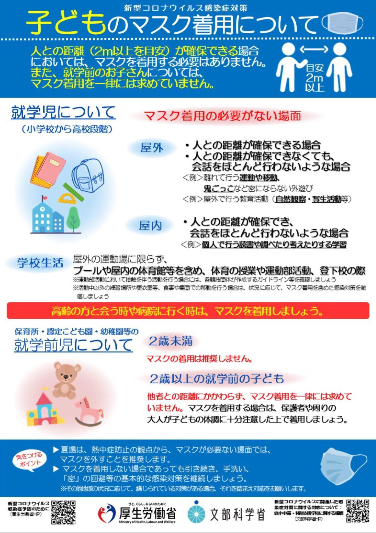 今後は熱中症対策を優先し、小学生は自分で判断が難しい年齢であることから、マスクを外すよう、子どもへ積極 的な声かけを行ってまいります。