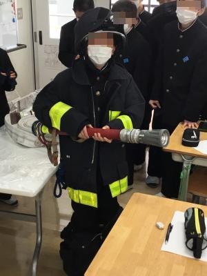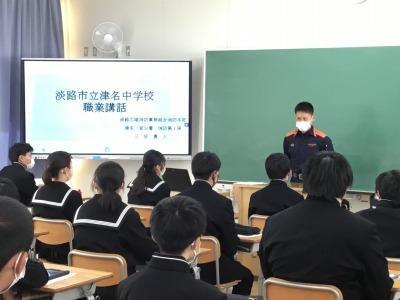 淡路広域消防事務組合津名一宮分署からは講師の方が来校し、消防士の仕事をくわしく説明してくれました。また、お話を聞くだけでなく、実際に仕事で使う道具などに触れる体験活動もありました。