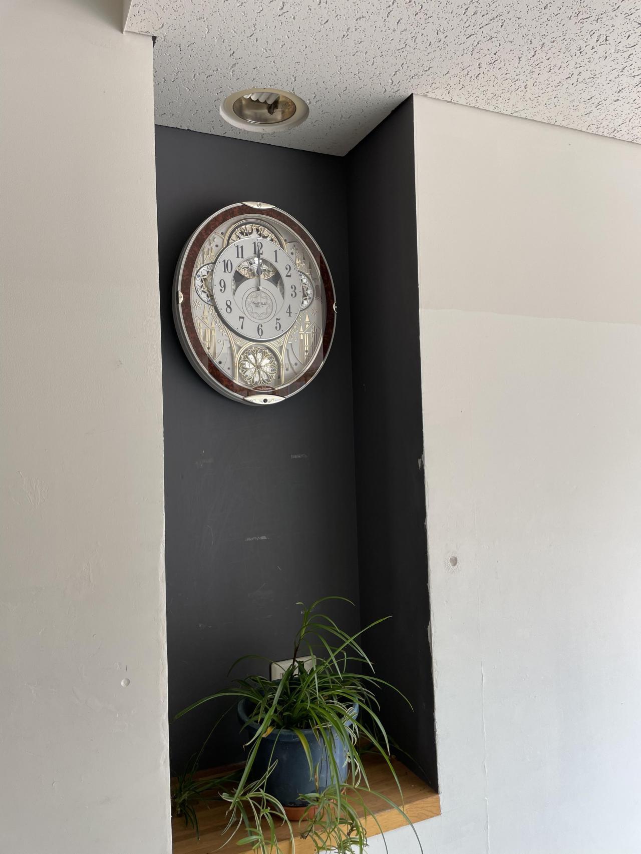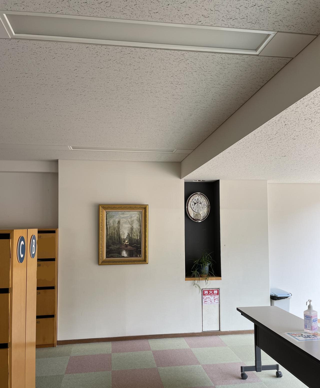 柱時計は生徒玄関に。このスペースは、以前は公衆電話が設置されていましたが、現在は移設され、空きスペースに寂しさが漂っていた空間です。写真のように飾らせていただきました。あたかも最初からそのように計画されていたかのようなフィット感です。日々、生徒たちを見守ってくれる時計となります。