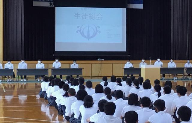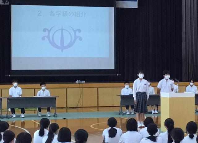 生徒会長のあいさつで始まり、続いて評議委員によるクラス紹介、生徒会基本方針、生徒会・各委員会の年間計画の提案がありました。