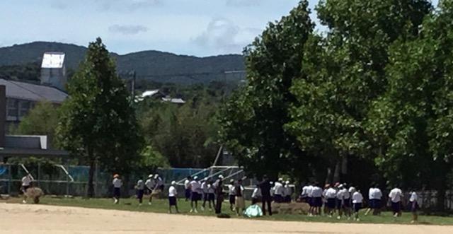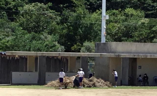 3時間目の途中からは、全校生徒と先生達でグラウンドの草を集めました。みんなで協力することで、短時間で作業も終了しました。