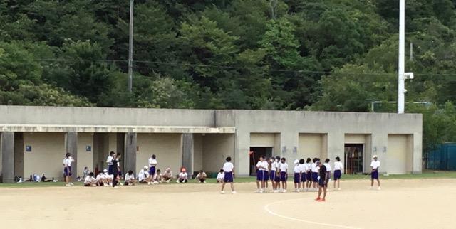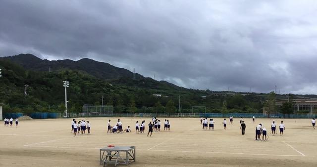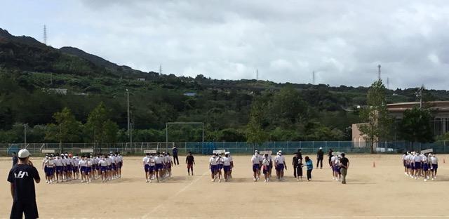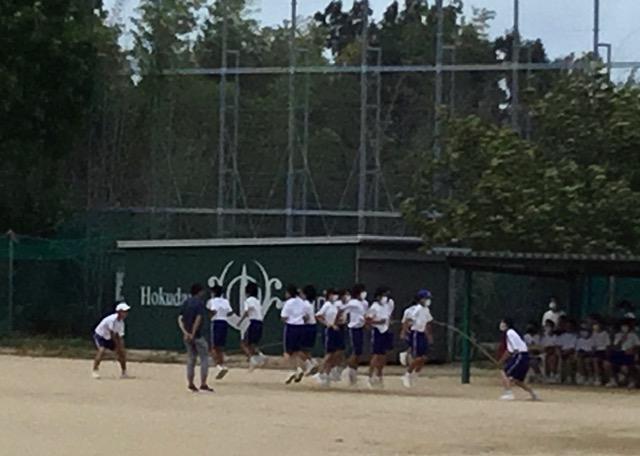 台風の影響で強い風が吹きグラウンドの木も子どもたちを応援するかのように揺れる中、体育大会の練習3日目を行いました。