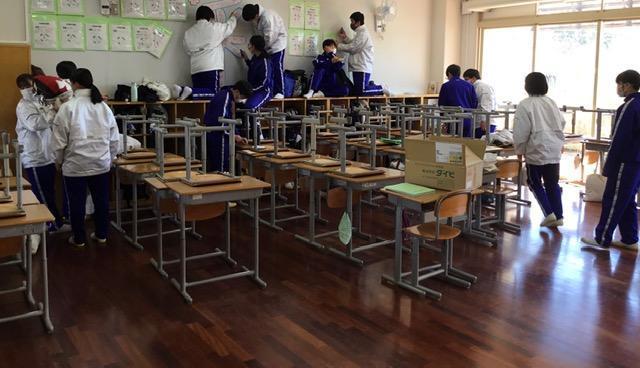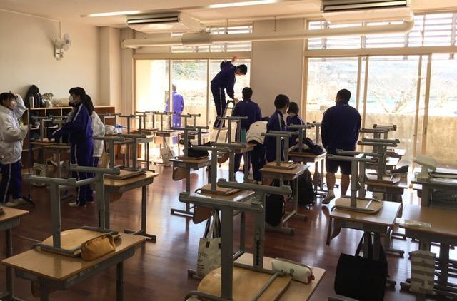 3年生は、3年間の感謝の気持ちを込めた「愛校作業」を行いました。みんなで一緒に掃除するのも「これで最後だ。」という思いもあってか、一生懸命作業をするとともに、おしゃべりにも花が咲いていました。