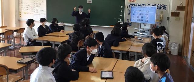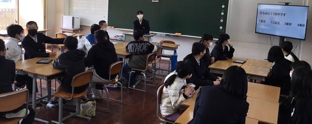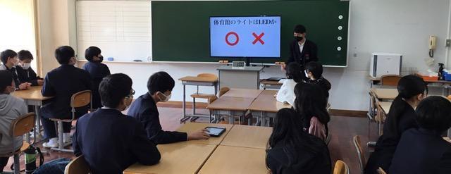 本日(3月13日)、北淡中学校新入生体験入学を行いました。最初にある全体会において、「生徒会長のあいさつ」と「登下校のルールについて説明」を行いました。