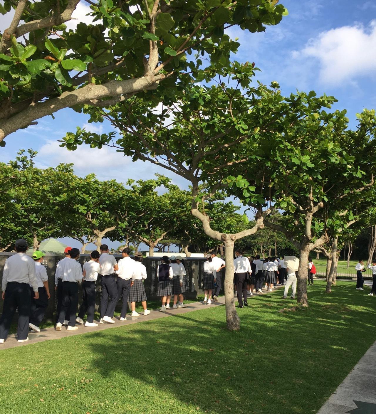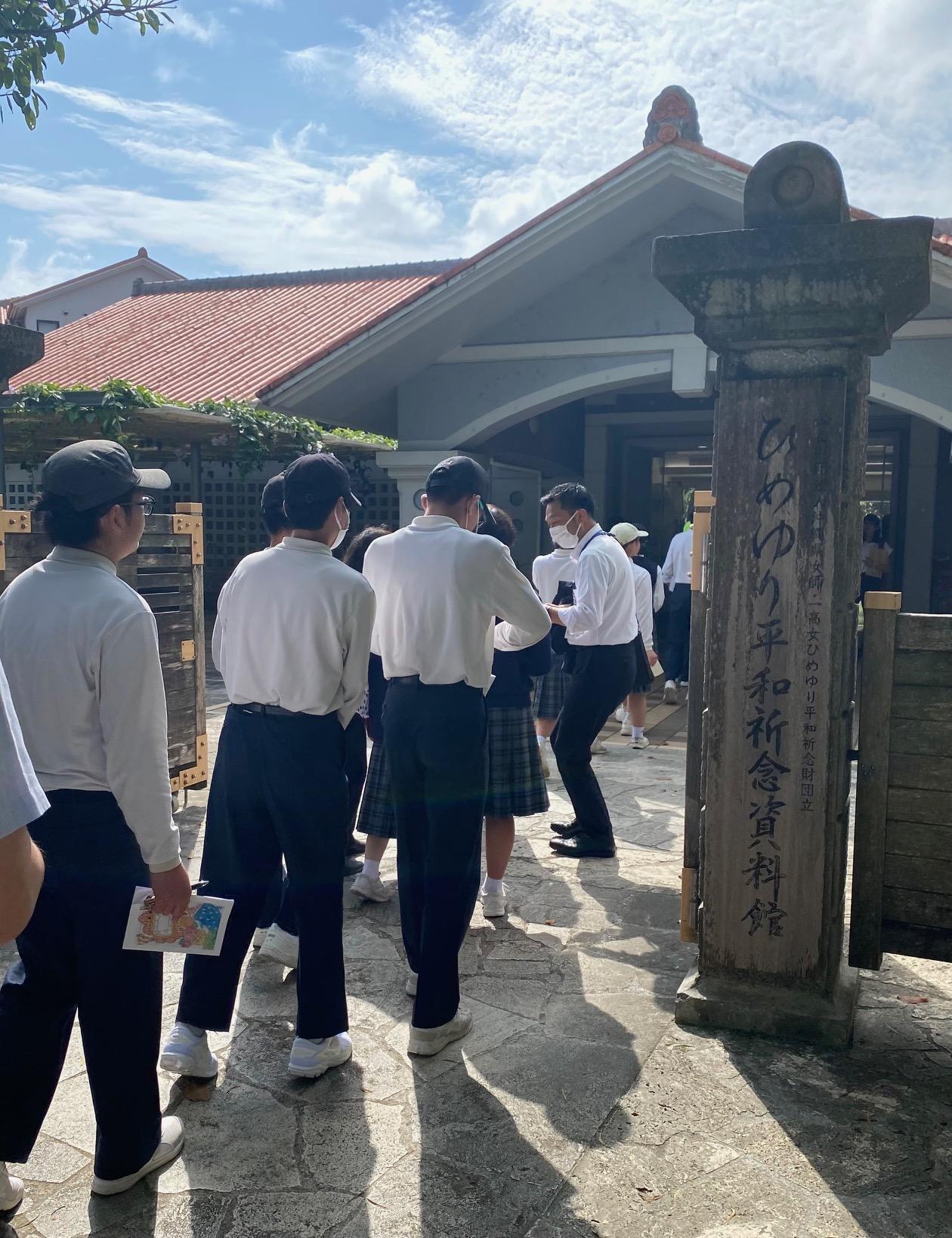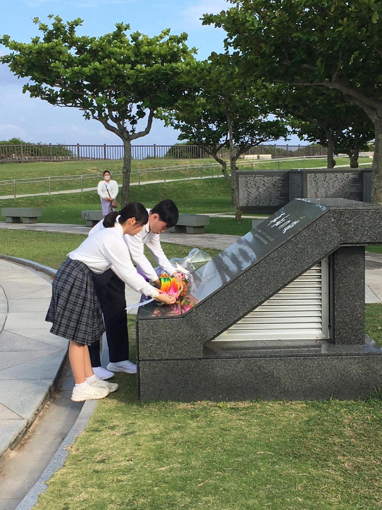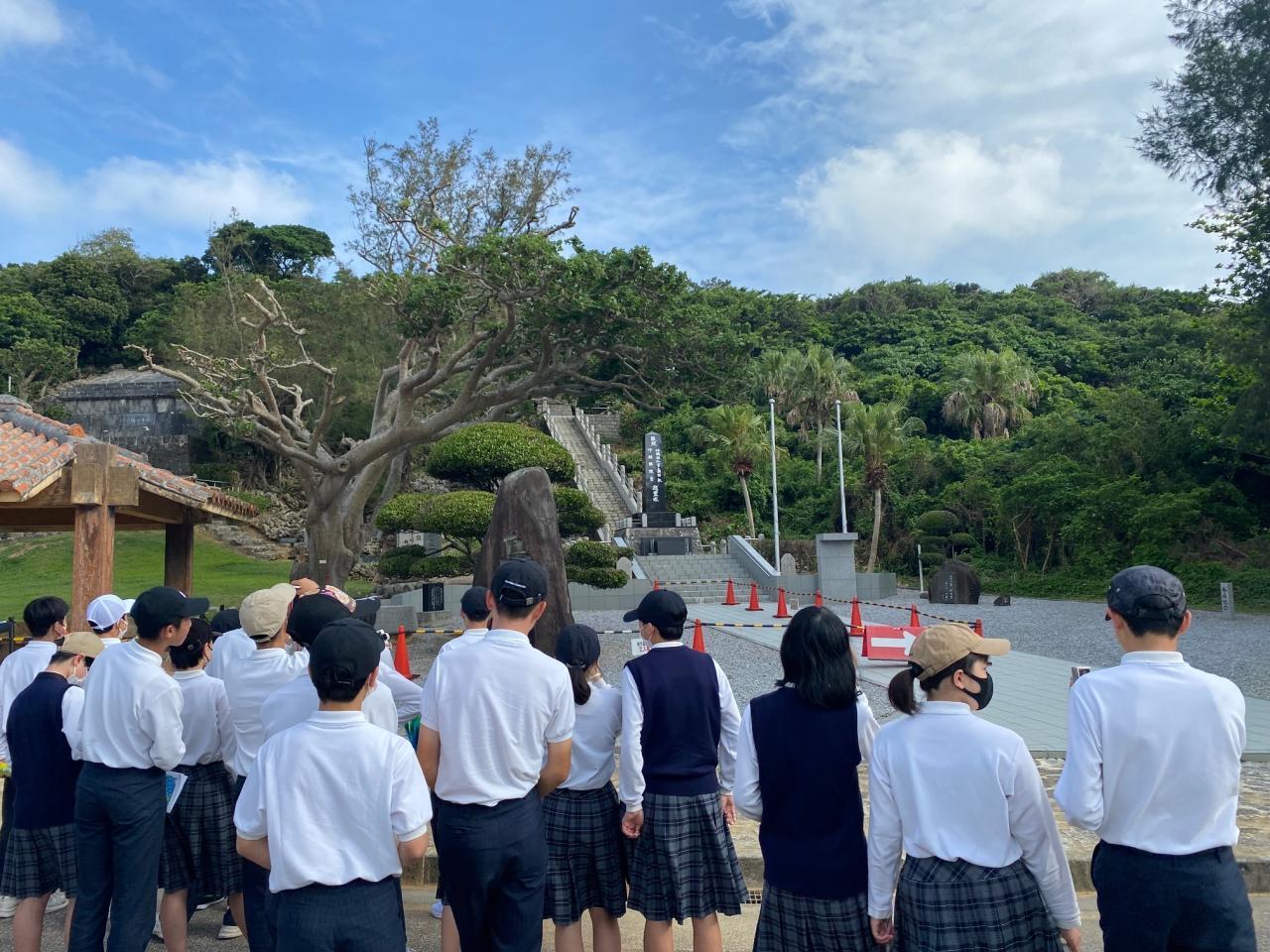 1日目の午後、おきなわワールドの後ひめゆり平和祈念資料館を見学しました。40分ほど生存者の方の証言等から平和学習をしました。そして、平和祈念公園へ移動して島守の塔や平和の礎を見学し、セレモニー(平和集会)を行いました。セレモニーでは、次のような平和宣言(抜粋)をし、千羽鶴を献納しました。