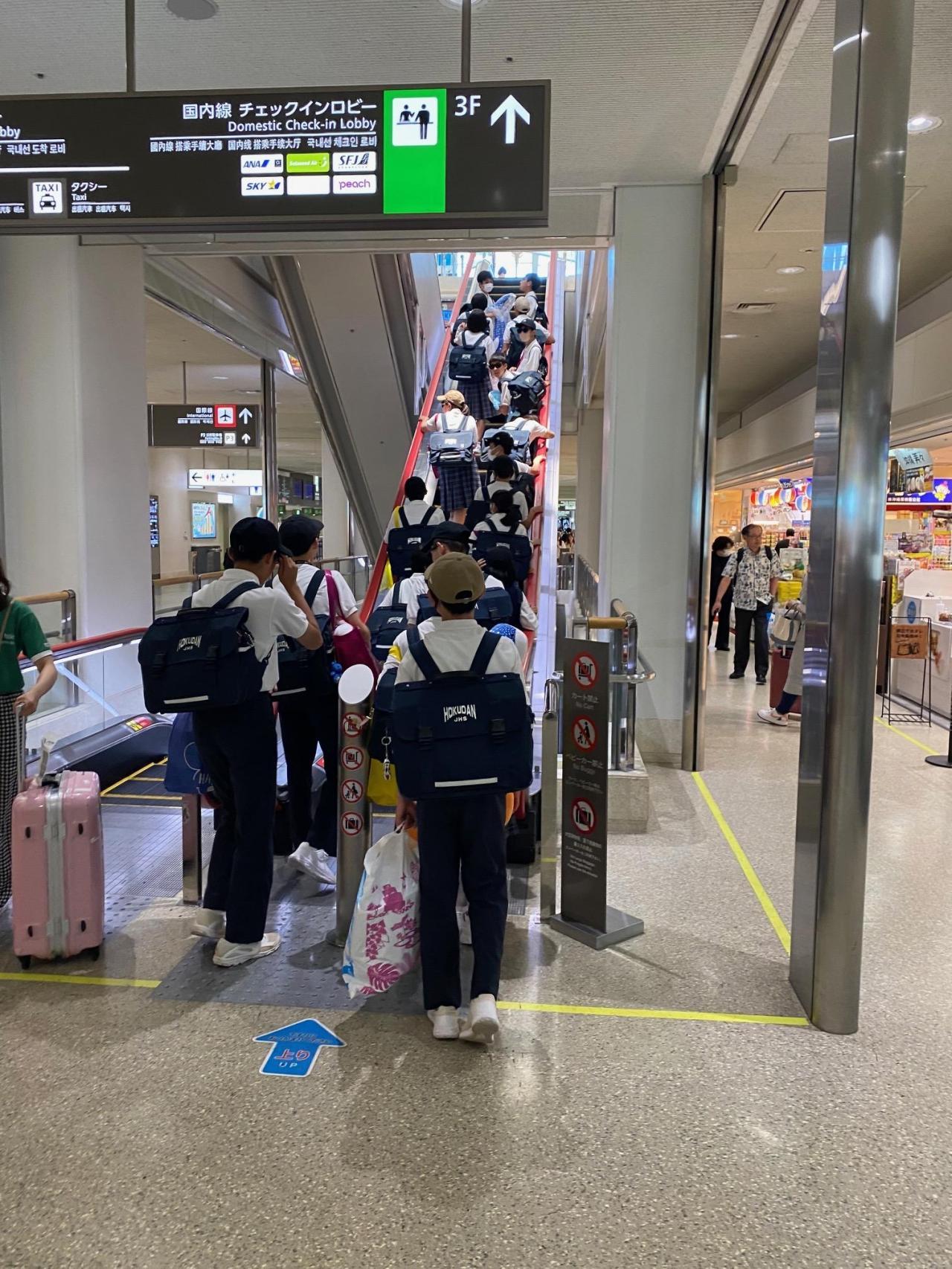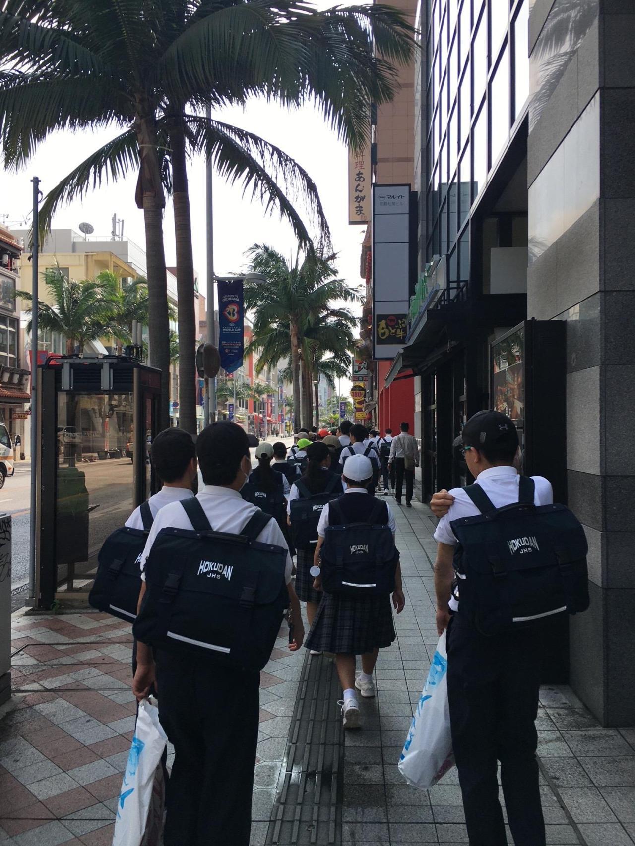 修学旅行三日目の朝は曇っていたのですが、次第に天気は回復し、予想以上に晴れて暑かった国際通り散策でした。気持ちも厚く気分も上げ上げの人がたくさんいました。また、沖縄美ら海水族館アンテナショップ「うみちゅらら」ではくじ引きでぬいぐるみをゲットした人が沢山いました。今日が最後でしたが、とても充実した3日間を過ごすことができました。普段の学校生活では体験できないこともたくさんありました。中学校生活の温かい思い出の1ページを飾ってくれたことと思います。友達の意外な一面が見えたり、やさしさに感動したりと、これまで以上に絆が深まったことでしょう。これからの学校生活でもその絆(仲間)を大切に、より充実したものにしてくれることと思います。
