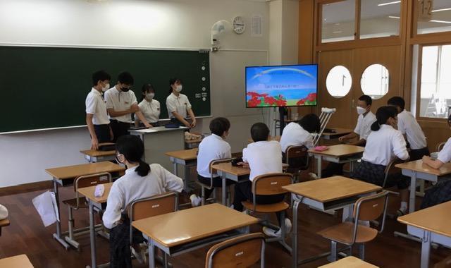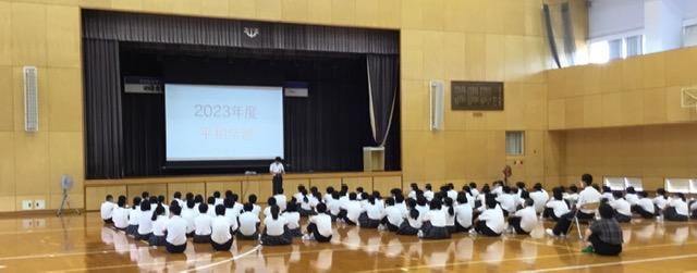 平和集会では、校長と生徒会長から平和についての話と「平和宣言」を聞き、ウクライナの様子の映像を見ることで、平和の尊さについて全校生で考え、黙祷を行いました。