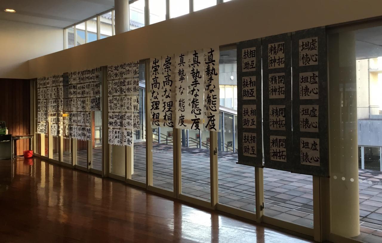 明日(11月9日)は、北淡中学校の文化発表会です。明日の本番を前に、会場の様子を少しだけお伝えします。メディアセンターには、書写作品が飾られています。