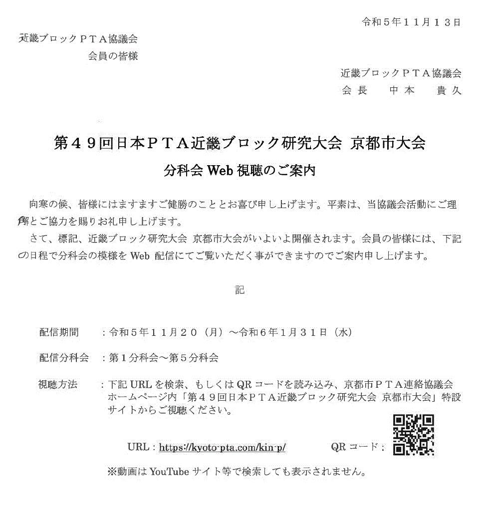 さて、標記の件について、別添のとおり兵庫県PTA協議会を通じ、京都市大会事務局から近畿ブロック研究大会 京都市大会分科会Web視聴のご案内がありました。今年度は、北淡小学校PTAの発表があります。