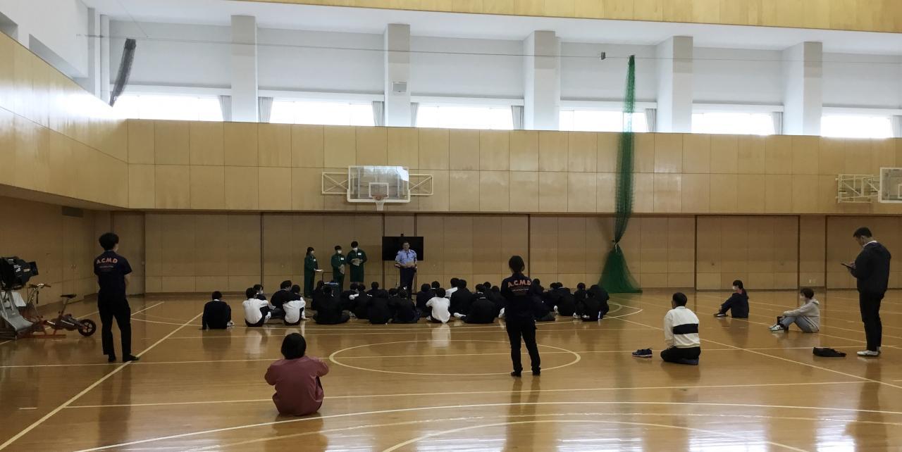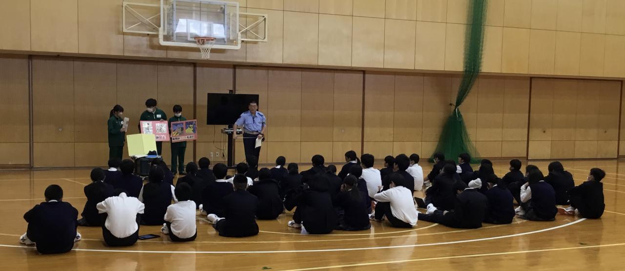 本日(5月13日)、1年生が交通安全教室を実施しました。淡路警察署の交通安全課の方と淡路市危機管理課の方とトライやる・ウィークで体験をしている東浦中の2年生3名の方が講師となって下さいました。雨天によりグラウンドでの自転車訓練はできませんでしたが、体育館内でもとても充実した学習ができました。