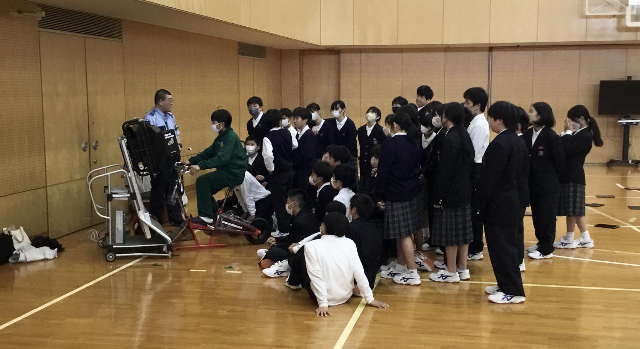 講話の後には、自転車シュミレーターを使っての学習を行いました。みんな興味津々で、早くやりたいという様子が見られました。自転車シュミレーターは県内に数台しかない貴重なモノで、その値段を聞いてみんなビックリしていました。Σ(・ω・ノ)ノ!