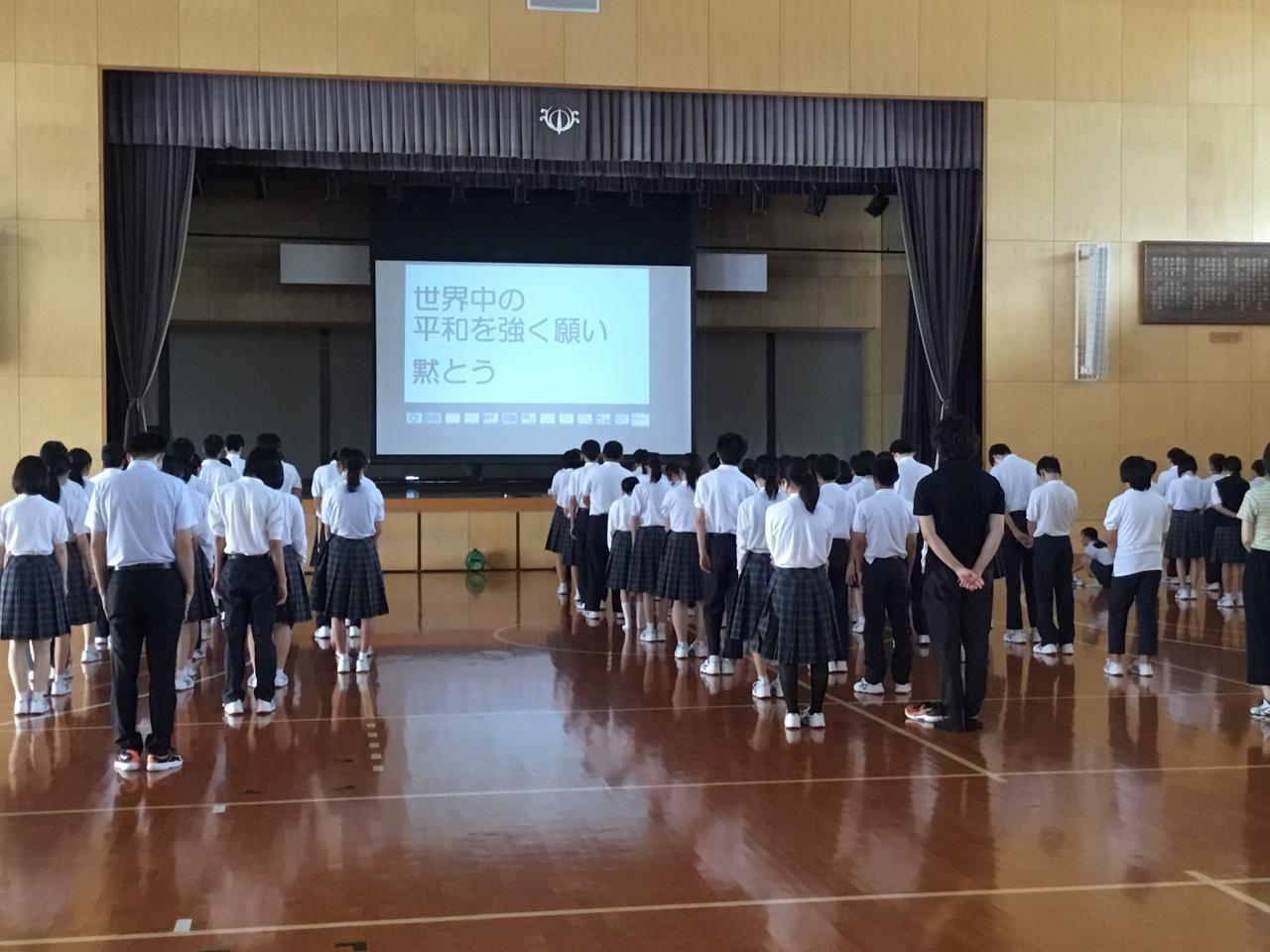 その後、全校生徒で「世界中の平和を強く願って」黙とうを行いました。