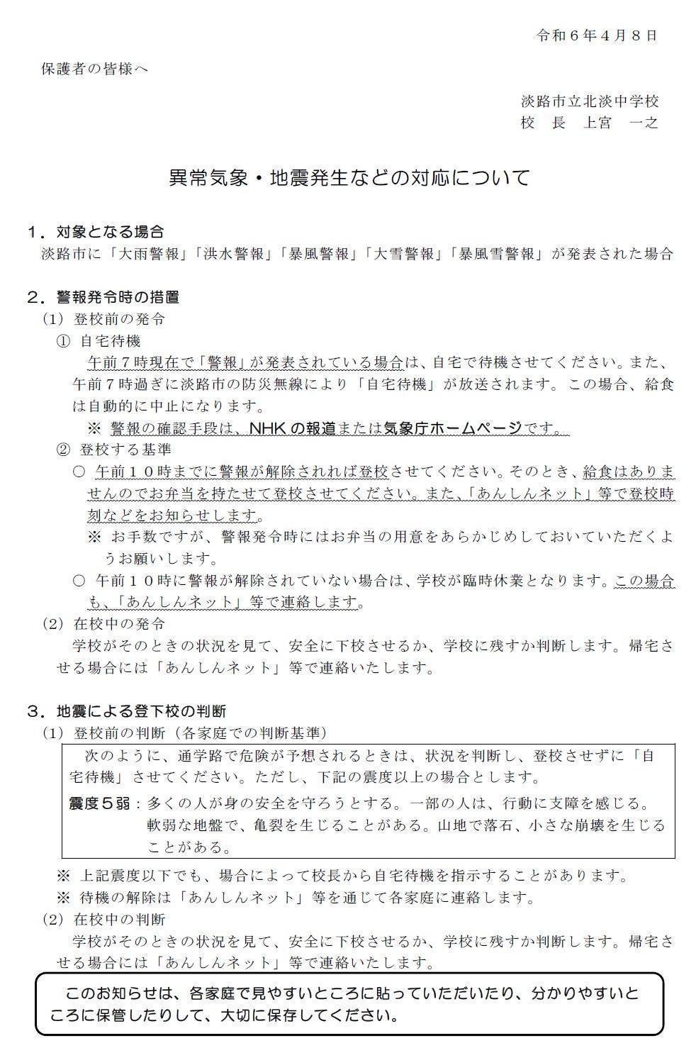 ※4月8日付に配布しました「異常気象・地震発生などの対応について」も、ご確認下さい。
