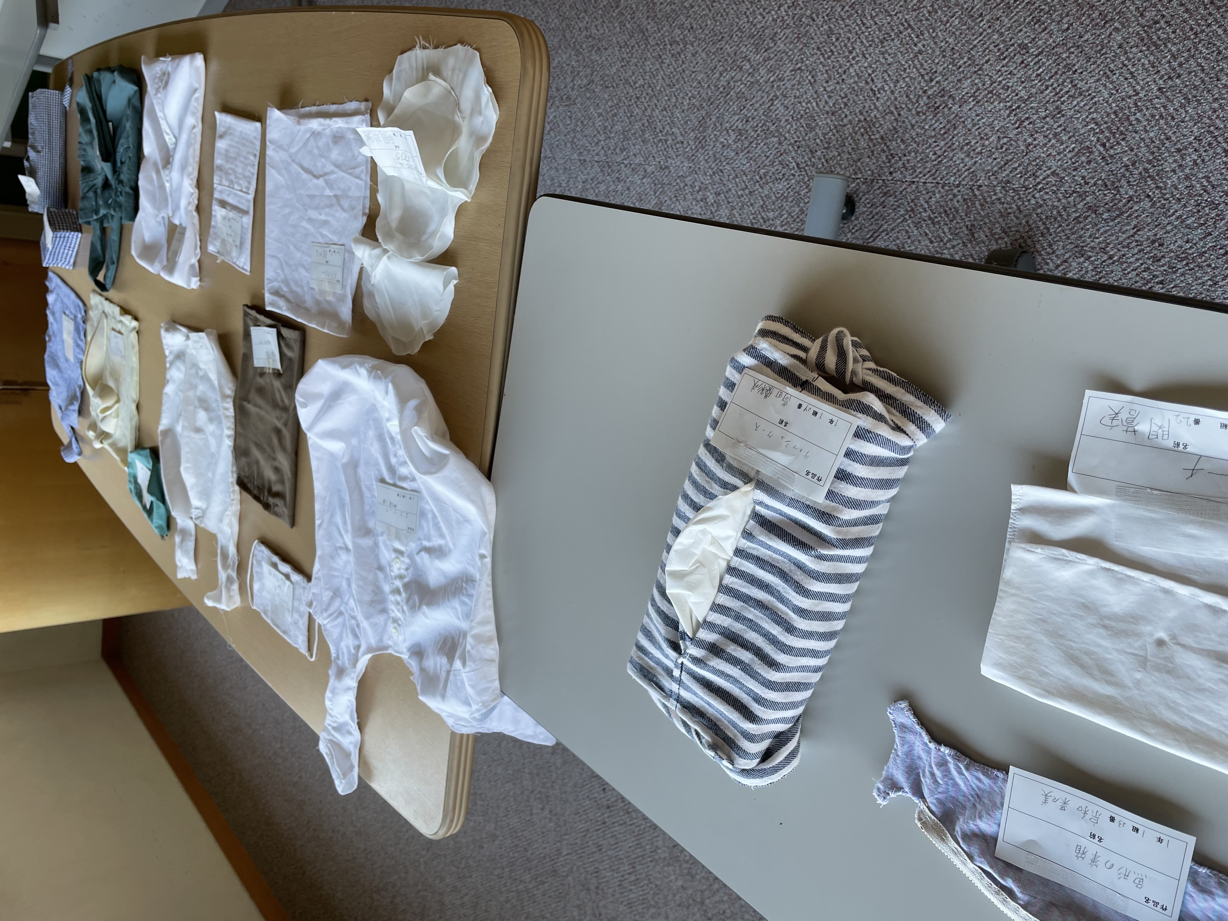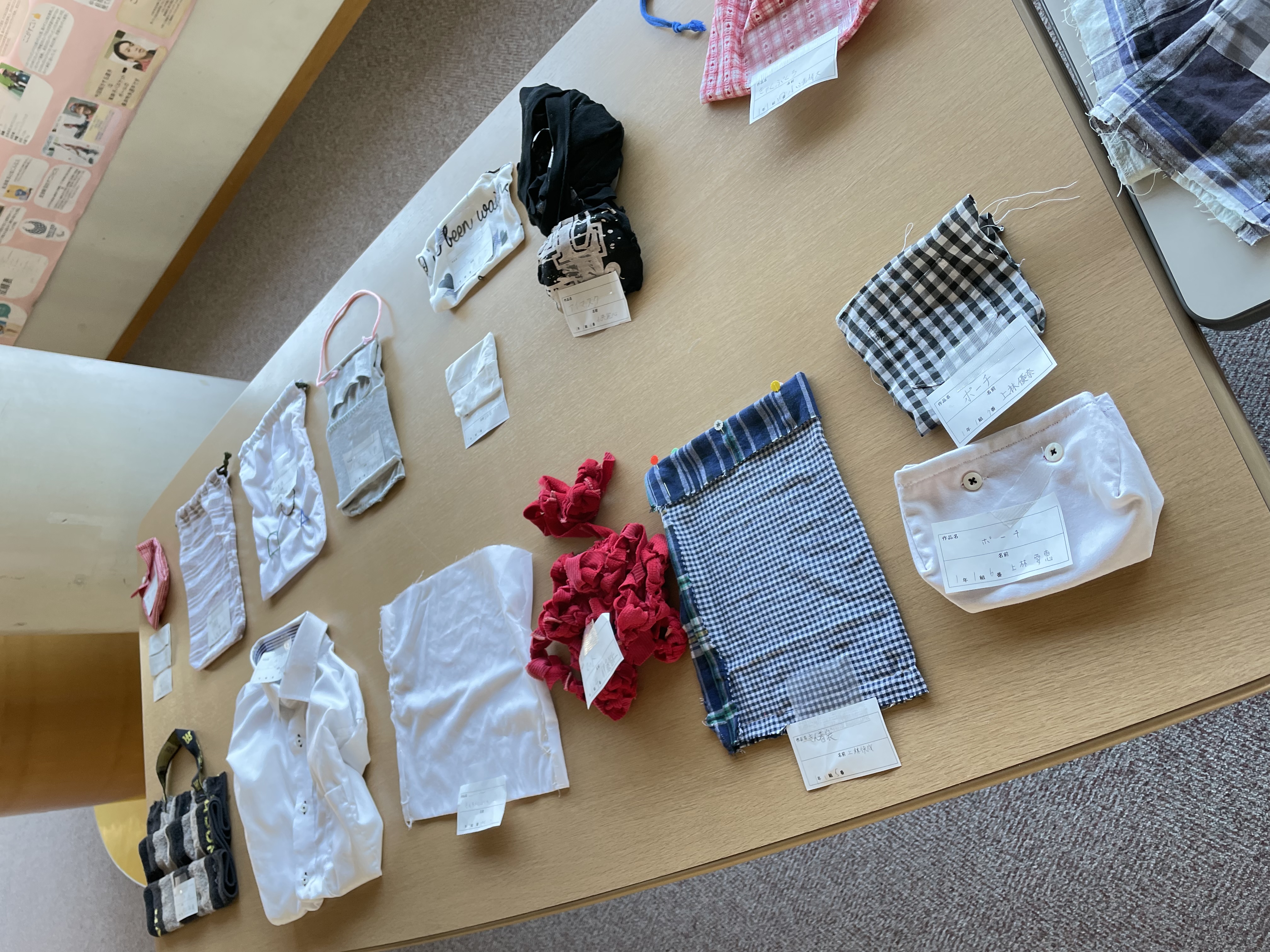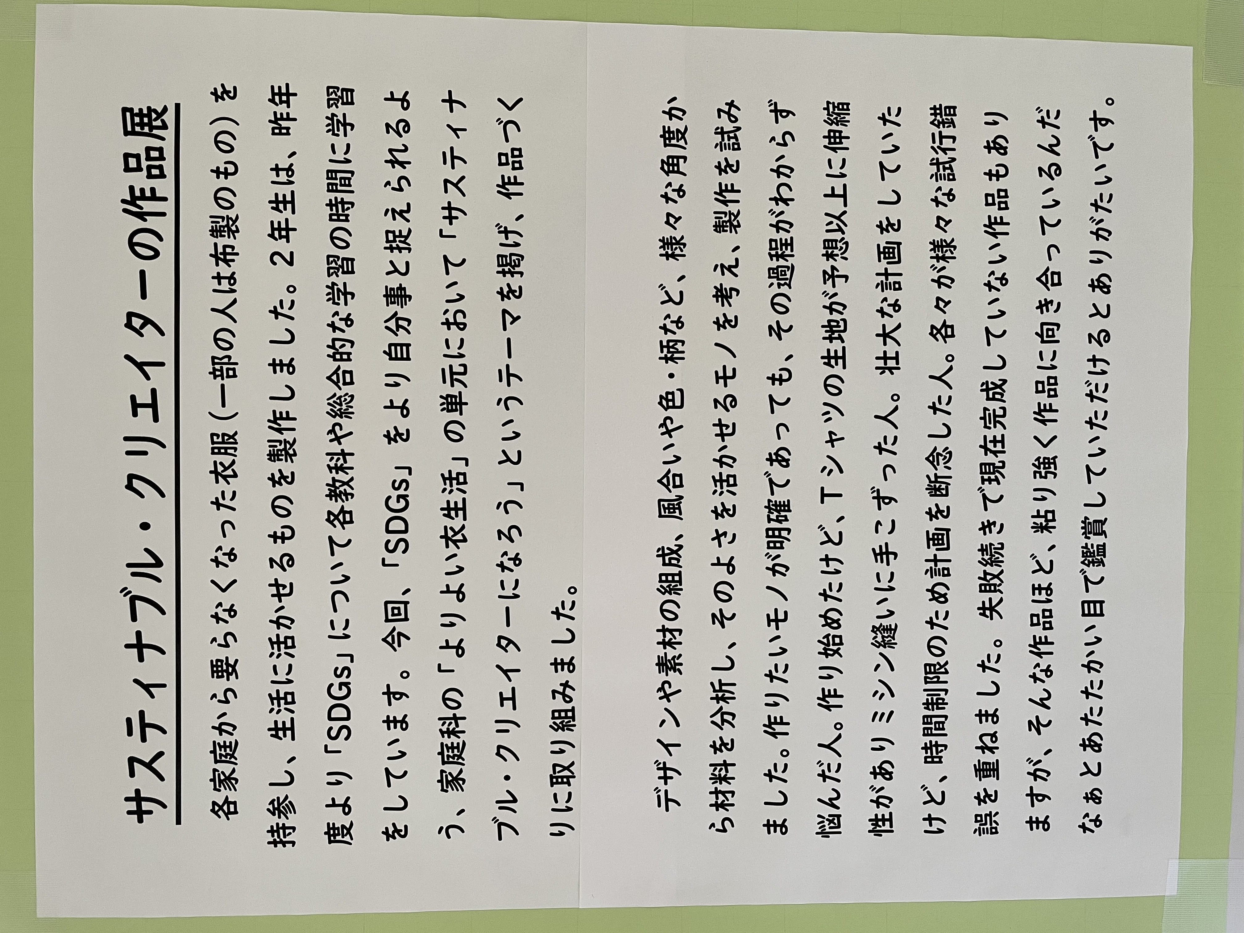 1・2年生の2 F待機スペースを活用して、「サスティナブル・クリエイター作品展」と題して作品展示をしています。これは、家庭科の授業でSDGsの視点から、家庭でいらなくなった衣服をリサイクルしようと取り組み作製したものです。生徒も苦心して仕上げたようですので、是非ご覧いただければと存じます。