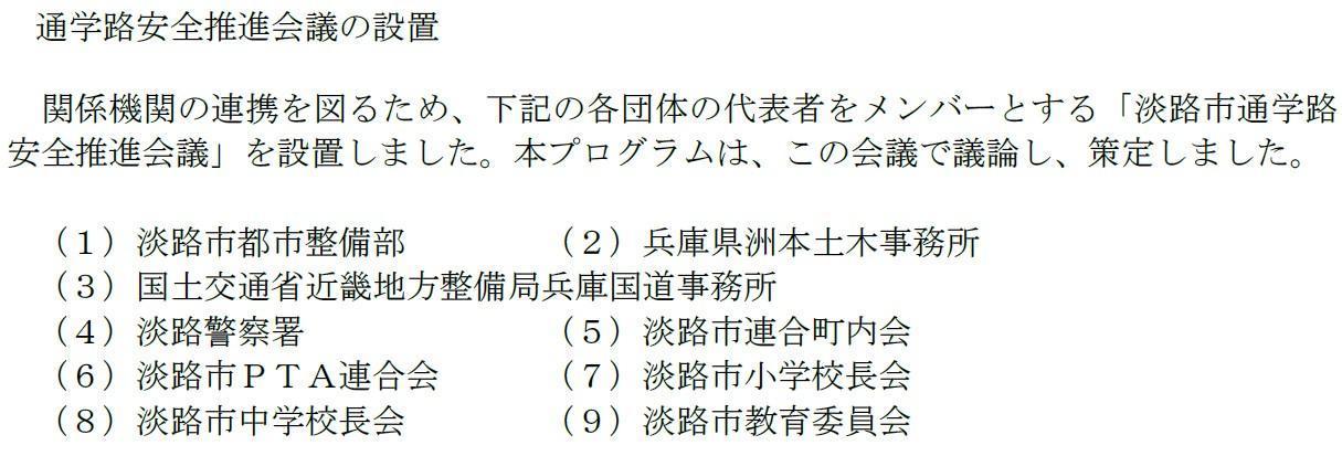 通学路の安全確保に向けては、下のような関係団体が推進会議としてワンチームになって取り組んでいるところです。毎年、7月ごろに要望箇所で立ち会い協議を行っています。