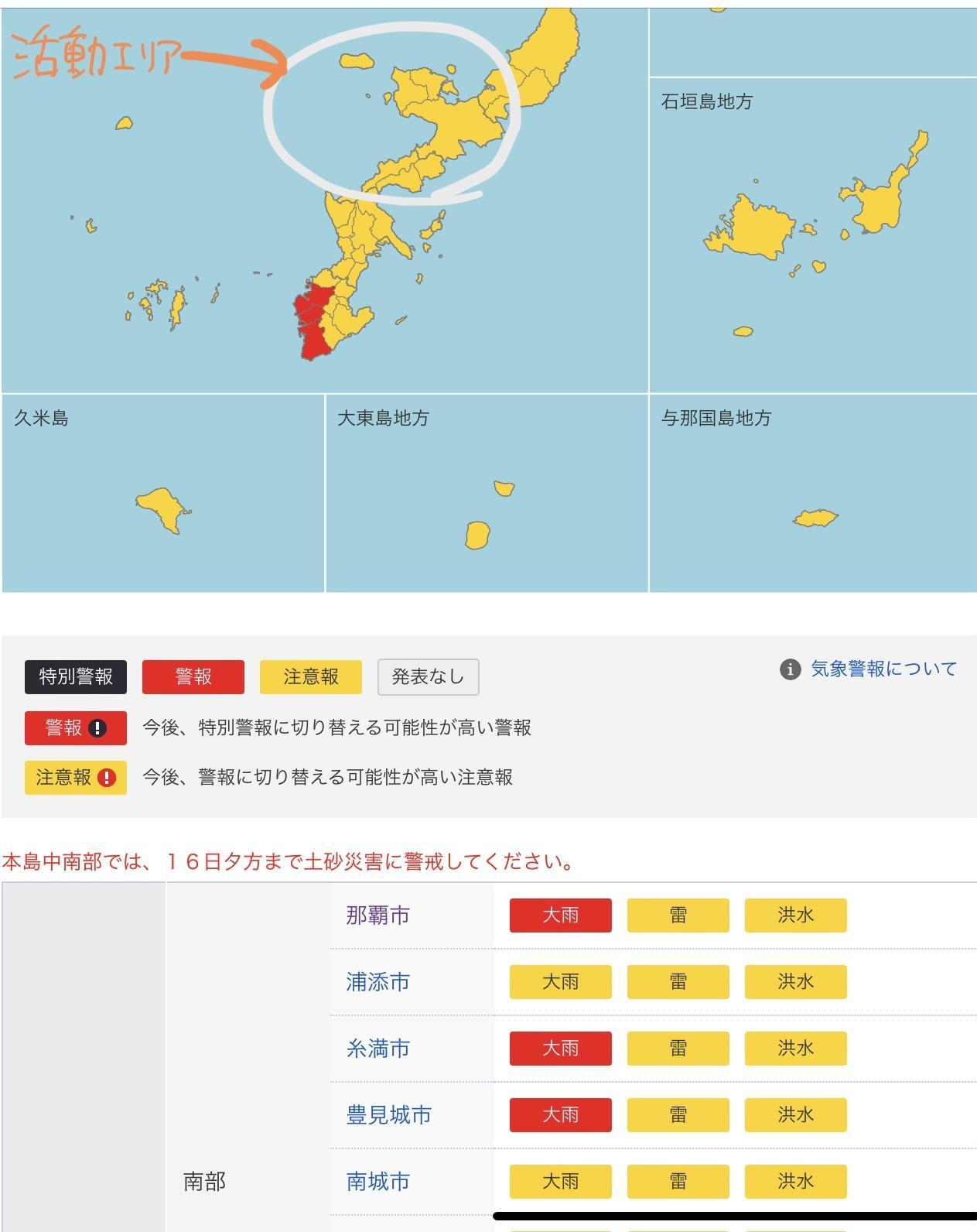 本日、沖縄本島の一部では警報が発令されています。大雨(土砂災害)が発令されているのは那覇市などの中南部で、生徒たちが班別活動を計画している地域には警報発令されていないため、予定通り行動します。