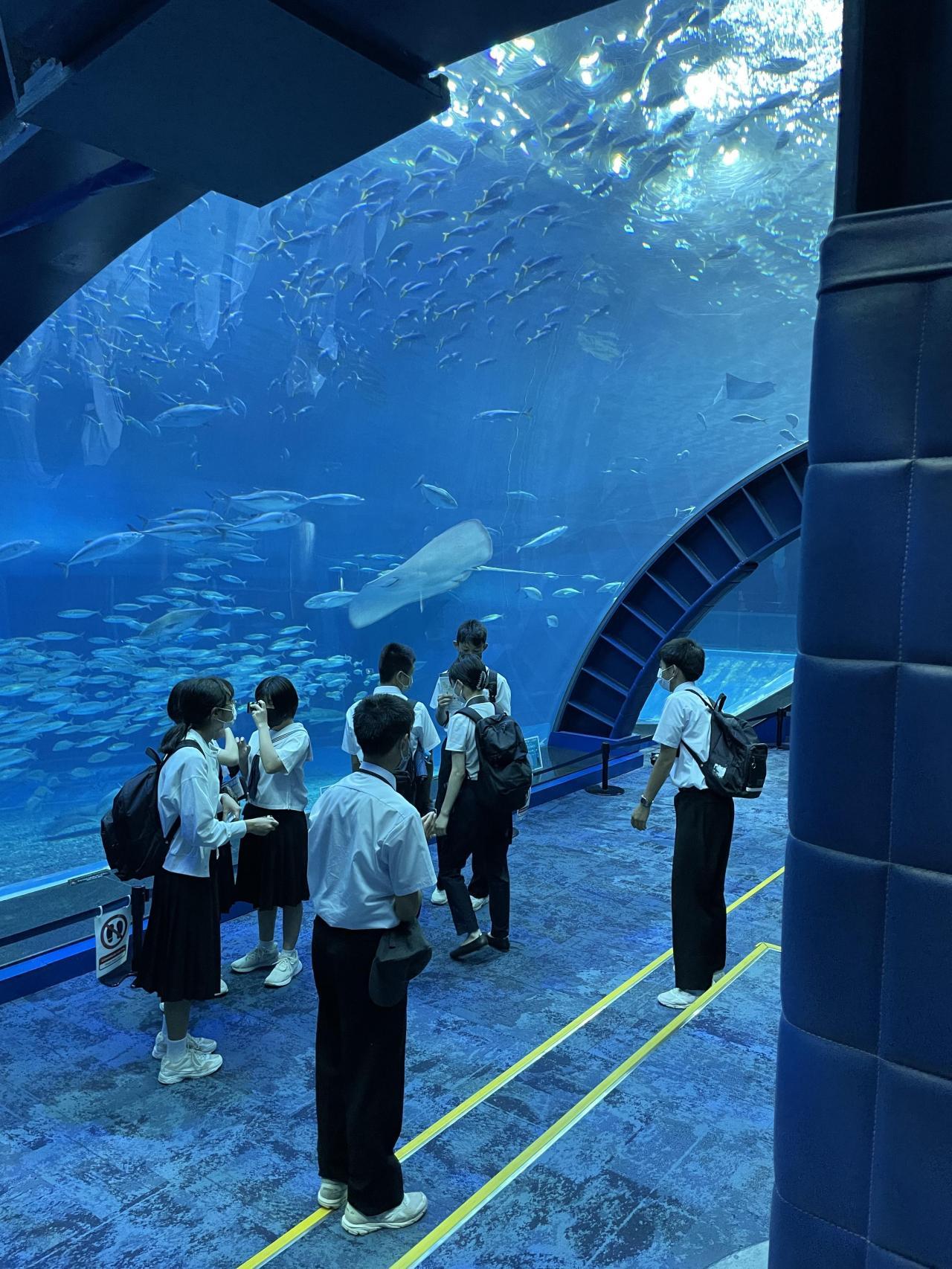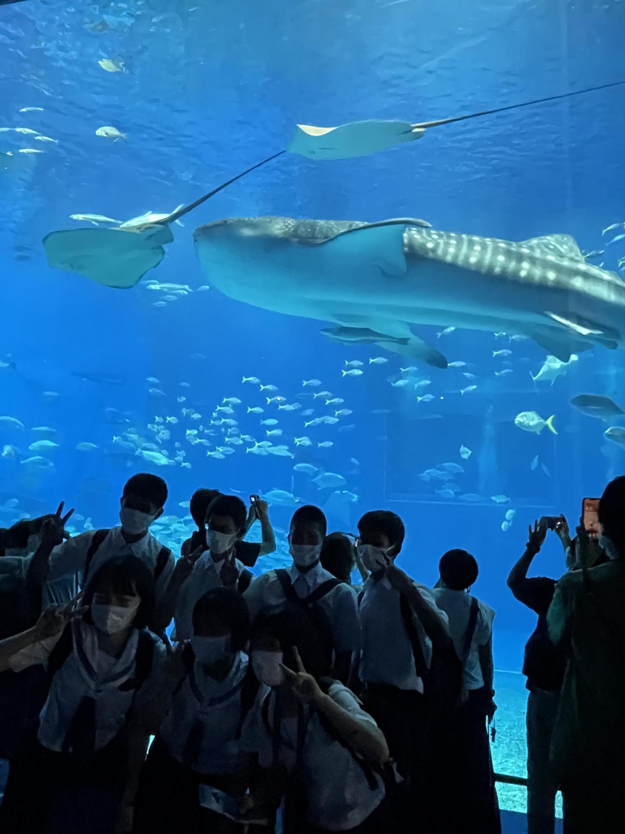 美ら海水族館のチェックポイント(ジンベイザメ水槽前)で全生徒の健康と安全の確認を行いました。サメのデカイ姿に驚きの声が上がっていました。