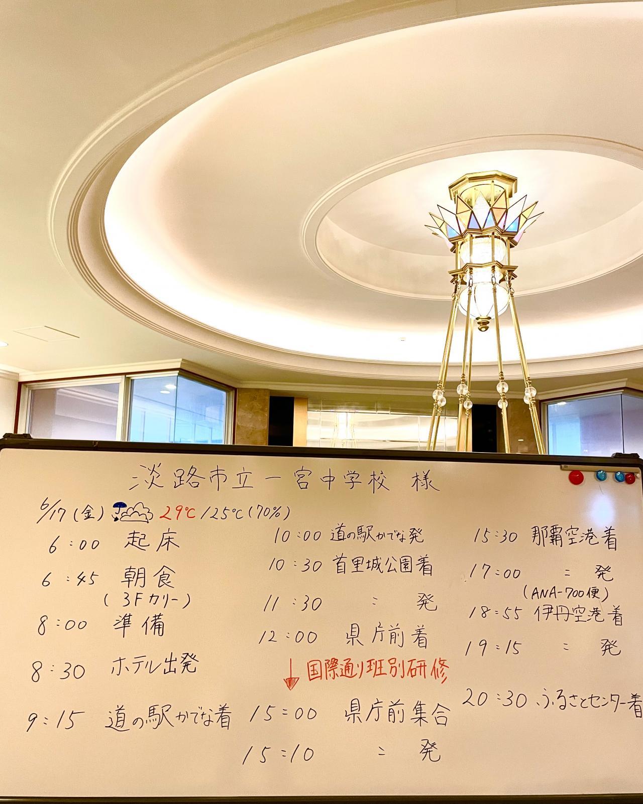 旅行社の方が手書きで行動予定をボードに示していただいていました。この3日間、ほぼ全ての行動が時間通りに進んでいます。生徒も先生も努力してのことですし、バスのドライバーさん・ガイドさん、タクシーのドライバーさん、ホテルの皆様、旅行社 J TBの添乗員さんなど、多くの方々に支えていただいてこその結果です。大変ありがたく感じています。このあとのスケジュールを順調にこなし、淡路へ帰りたいと思います。