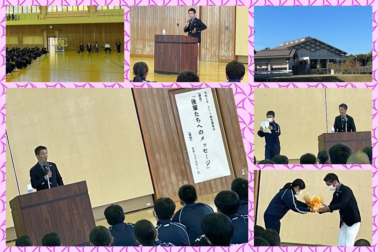お招きした講師先生は、高校野球大好き芸人としてご活躍の本校卒業生、かみじょうたけしさんでした。後輩たちへのメッセージと題して、「好きなことに夢中になること」「仲間を大事にすること」「夢を持つこと」「あいさつが大事」「素直であること」「生きていることは幸せ」など、生徒たちにわかりやすく、お得意の物真似も取り入れながら楽しくお話しくださいました。