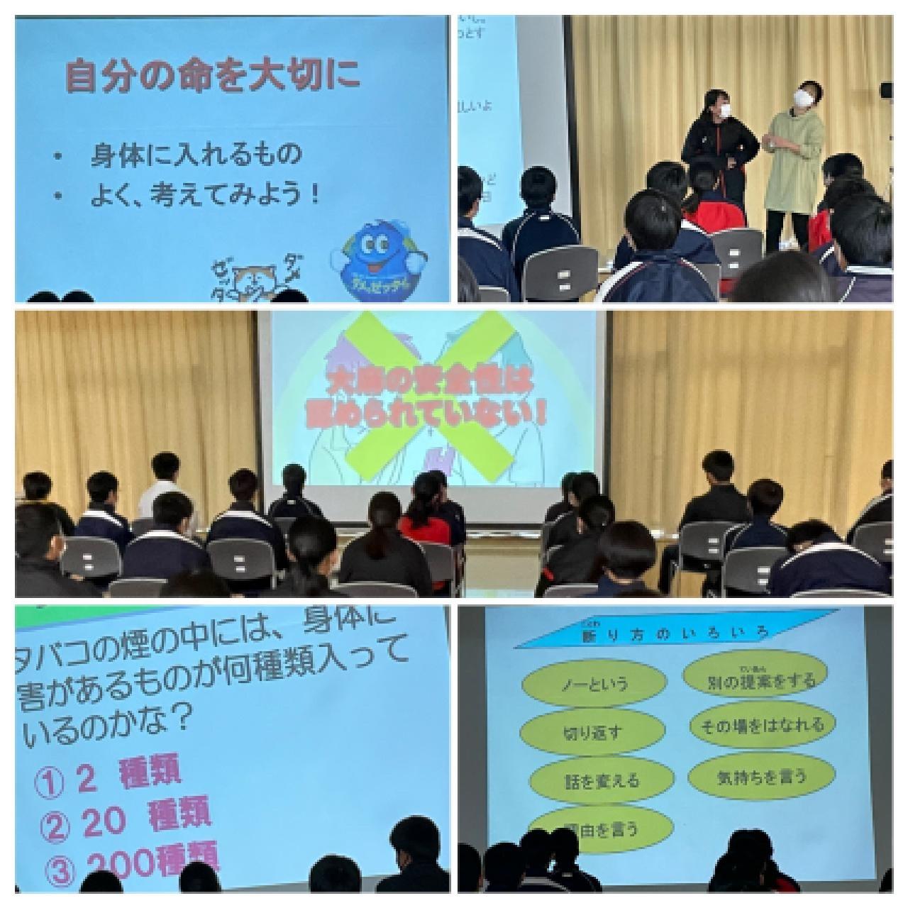 本校の学校薬剤師にお越しいただき、薬物の恐ろしさを改めて学びました。体育・保健の授業でも学んでいましたが、外部から講師を招くこと、さらには、たくさんの写真を見せていただいたり、誘いを断るロールプレイを体験したりすることは、これまでの認識をワンランク・アップさせる良い機会になると実感したところです。2年生の生徒も積極的にクイズに答えたり、悪い勧誘をしつこく仕掛けてくる悪役(先生方が熱演)を断固拒絶したりと、学習の成果を発揮していました。