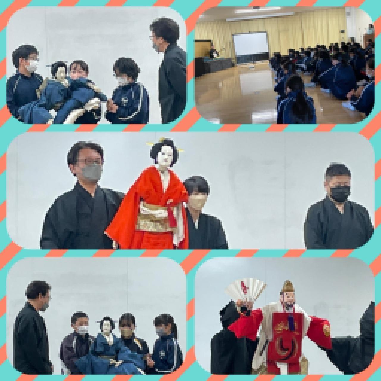1年生は淡路人形座の皆さんに学校にお越しいただき、伝統芸能を鑑賞。こちらも、「生写朝顔日記」より大井川の段を見せていただいたり、太夫や三味線の説明を受けたあとに体験コーナーがあり、3組の生徒+教師(1名)が登場すると、まさしく爆笑コーナーとなりました。いかに人形遣いの方々がプロフェッショナルかを、実感しました。人形が笑ったり泣いたりするしぐさは、まさしく人間のようでした。