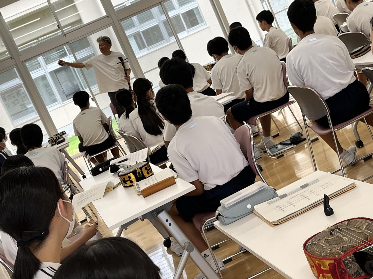 今回の体験学習は10月6日に三田市総合文化センターで開催される兵庫県総合文化祭/伝統音楽・音楽部門出演に向けての練習会です。このステージで三年生は合唱を発表するのですが、「沖縄の歌 ~童神・島人ぬ宝~ 」で三線の演奏も交えて発表の予定。一宮中の出番はラスト・大トリ!最後を飾るに相応しい素晴らしい歌声と三線の情緒ある響きを今からとても楽しみにしています!頑張ってください。