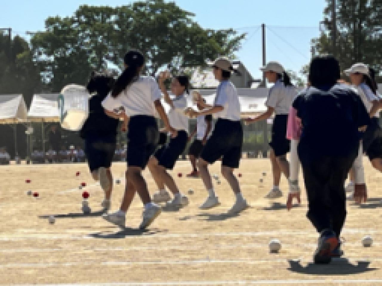 〇3年生:3年生の学年競技は「昼に駆ける~優勝に向かう3年生」です。準備が整いはじまりは「玉入れ」の様相ですが、籠を掲げるポールがありません。その代わりに籠を担いだ生徒がいます。あとはどのように展開するのか・・・。攻める側の工夫・・・逃げる側の工夫・・・。ついつい説明したくなりますが、どうぞ当日をお楽しみに。