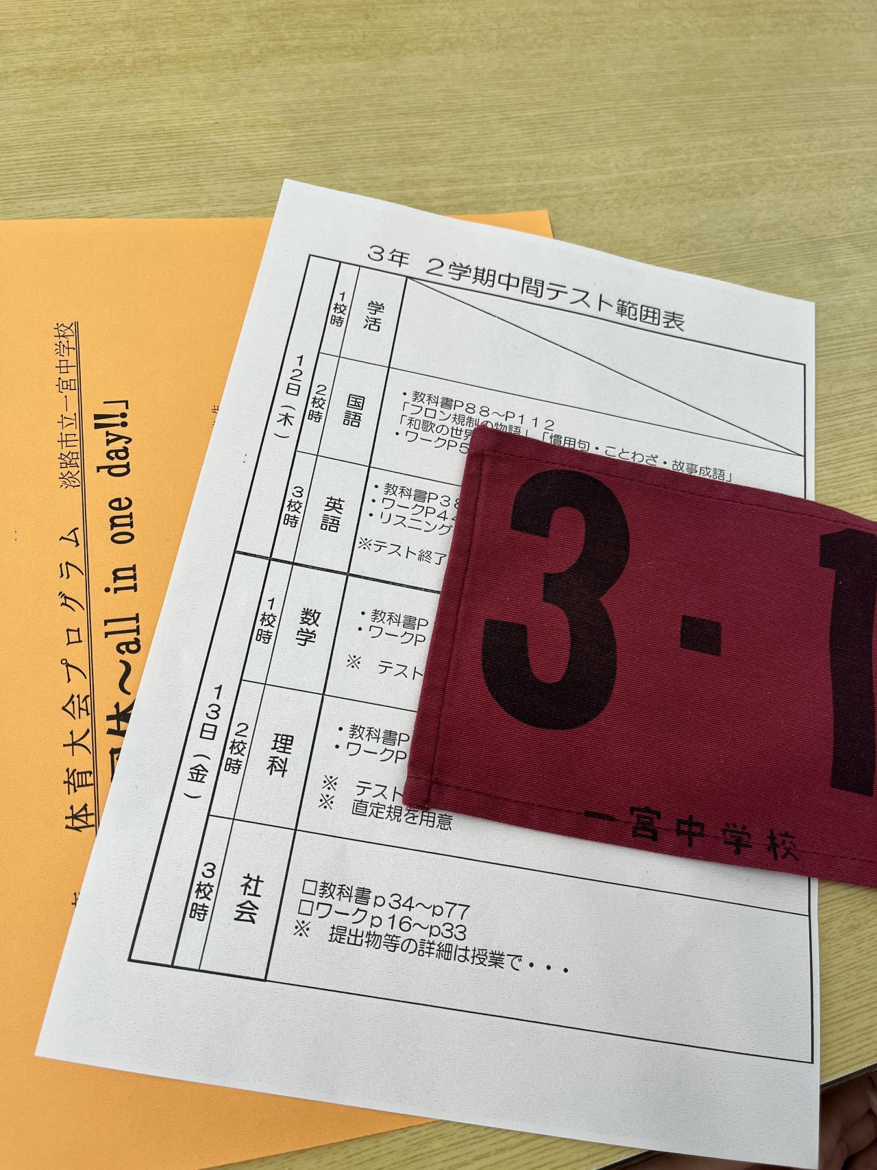 なお、プログラムのほかにゼッケンと、中間テスト範囲表を配布しています。ゼッケンについては縫い付けをお願いします。