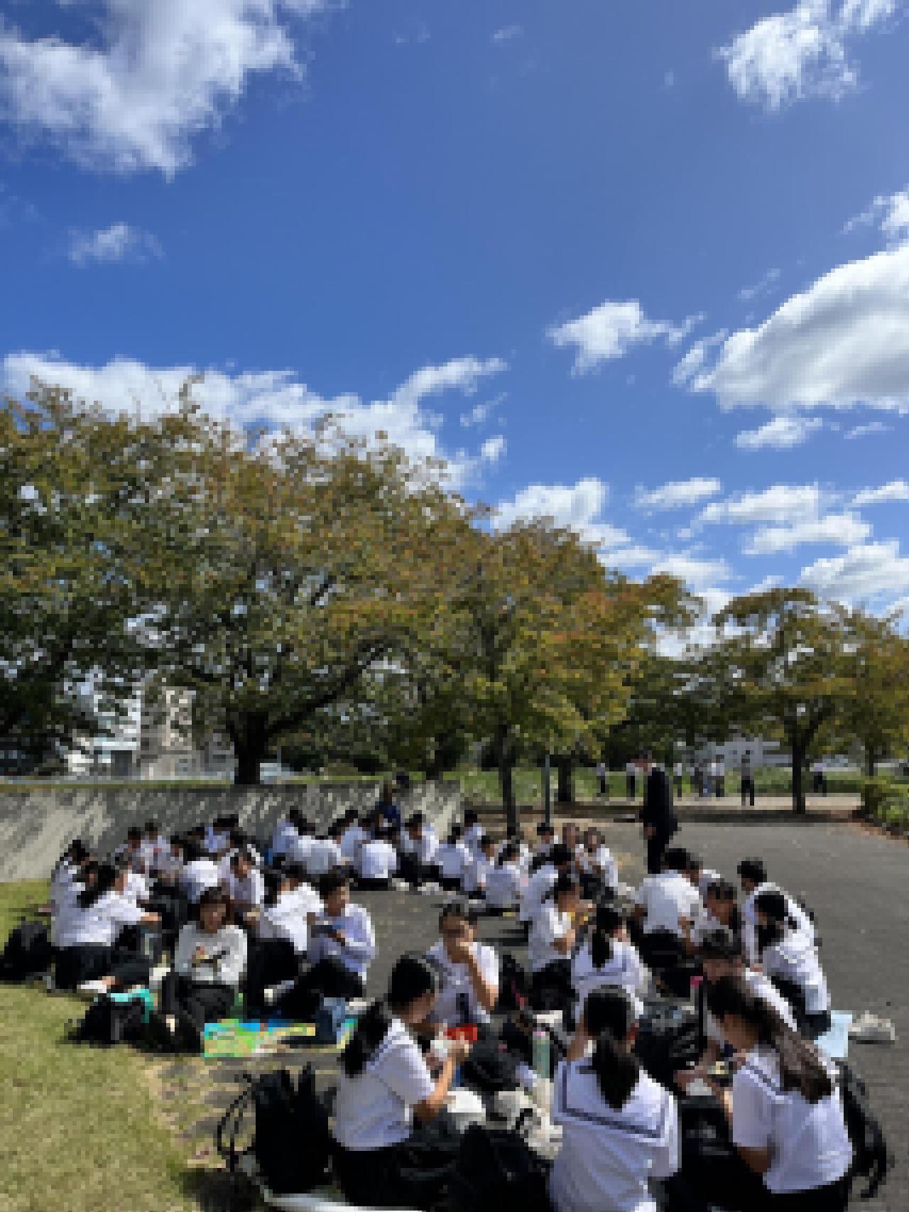 朝8時に集合して声出しのあと出発した生徒たちは、10時半頃からステージ・リハーサルを行い音楽ホールに響く自分たちの歌声を確認しました。正午までの時間を昼食にあてたのですが、屋外の芝生の広がるところでレジャーシートを広げ、さながら遠足気分を味わいながらのお弁当タイムに。