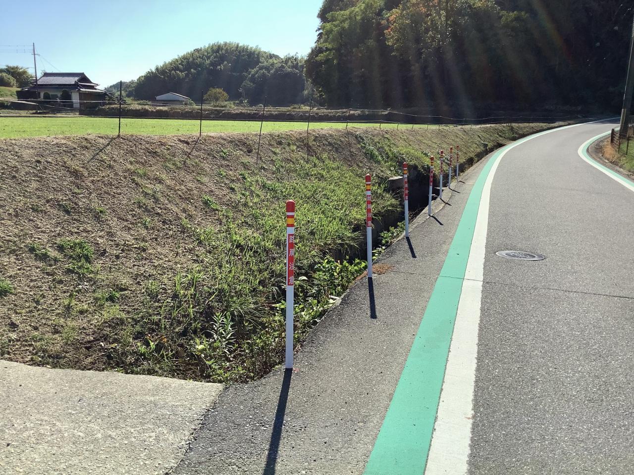 このように路肩の危険性と喚起するバーが7本新設されました。この道は道幅が狭く自動車が2台すれ違うのが難しい箇所もあり、自転車が脇へ避けざるを得ないような所もあります。これから冬を迎え突風・強風が吹く時期には、あおられることもあります。今回の対策により少しでも安全に登校できればうれしく思います。
