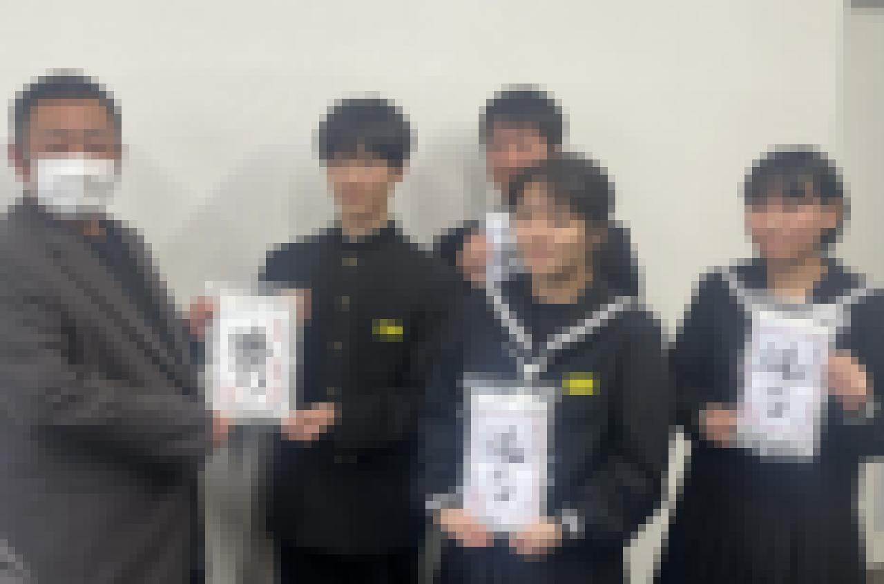 生徒を代表して生徒会本部役員4名が受領いたしました。海苔の生産者さんから、「地元の海苔を食べてもらい、地元で作られていることを知ってもらえれば嬉しい」とお話をいただき、生徒会長は「先日のオイル流出事故で大変な中にもかかわらず、このようにたくさんいただいてとてもありがたいです」とお礼を申し上げました。