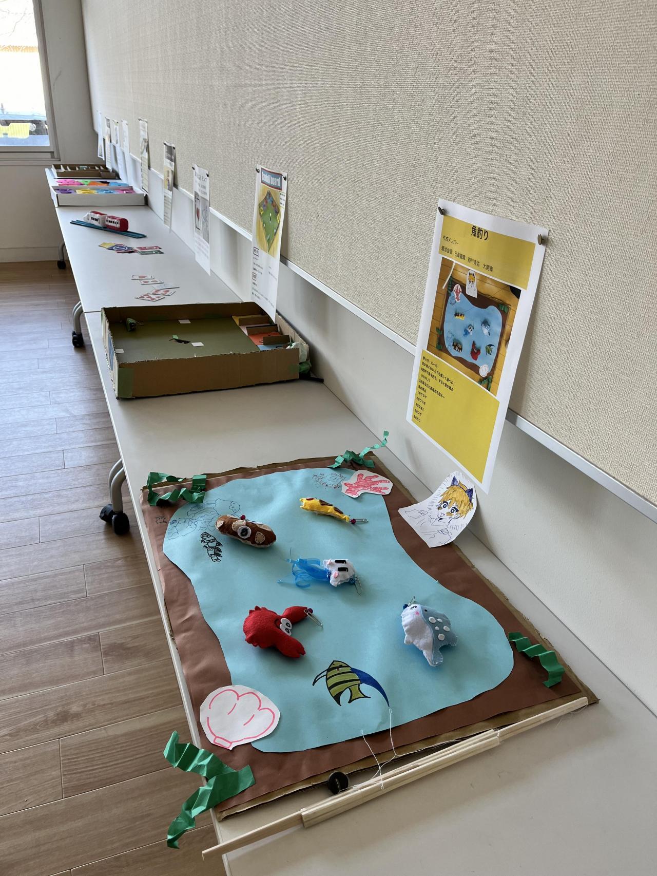 <美術の授業で>2年生がユニバーサル・デザインについて学び、それを考慮した作品を作成しました。どれも力作ぞろいです。美術室前に展示されています。