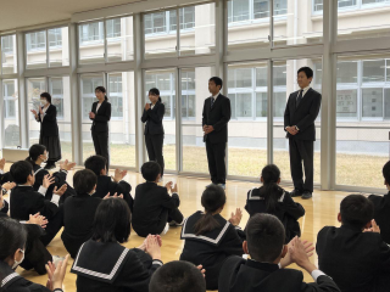 着任式では5名の先生方が着任。始業式では学校長式辞のあと、校歌を斉唱して式を締めくくりました。