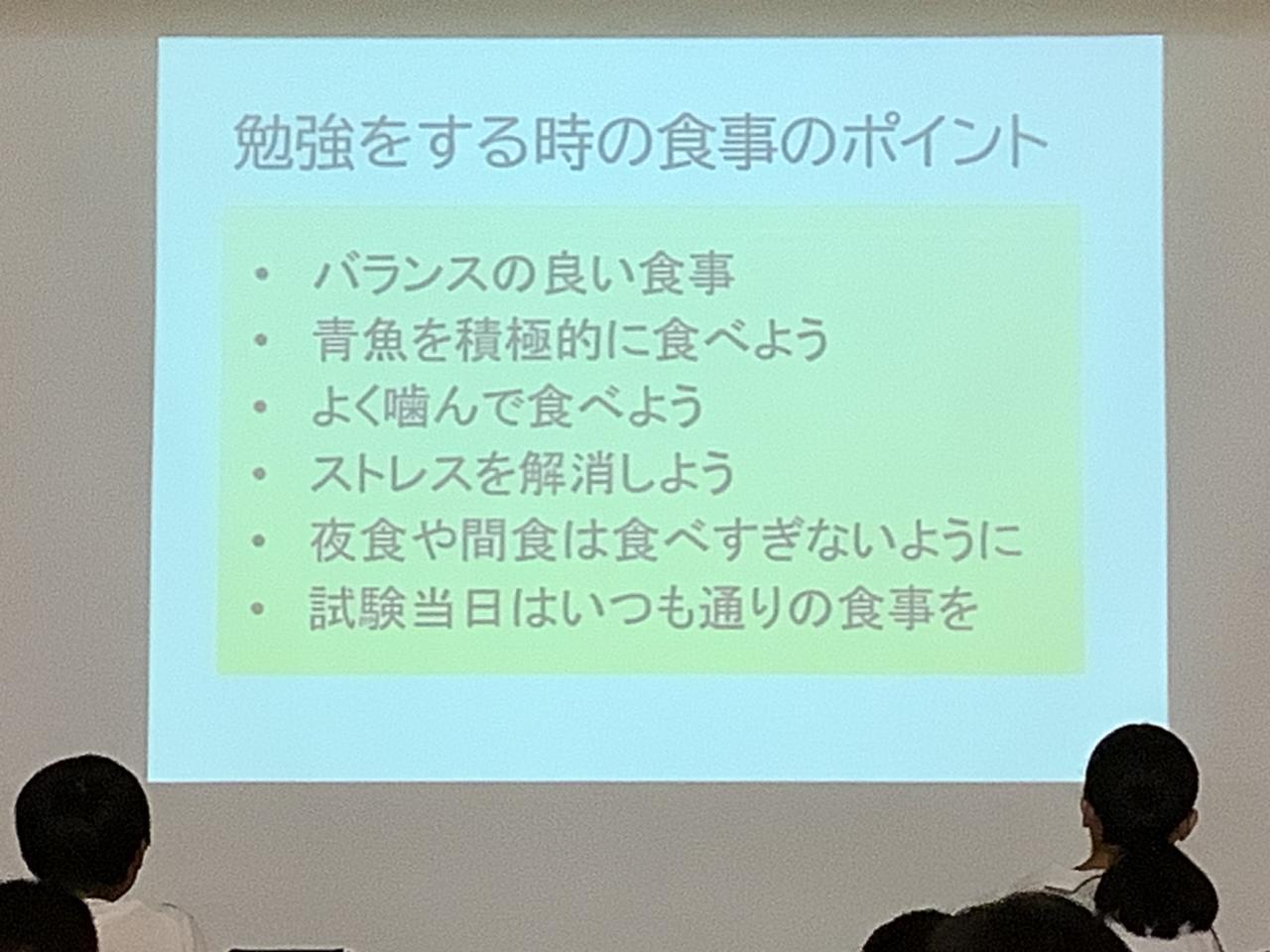 運動する前には消化の良い食材、運動後には体を作る炭水化物や脂物を摂取するのが良いことを学びました。勉強の時には青魚が良いそうです。