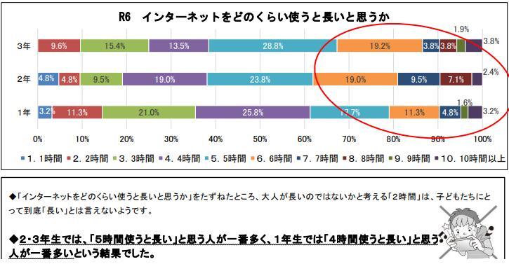 特に、◆1◆8時間睡眠を確保できていない生徒が多いこと ◆2◆2時間ぐらいスマホをいじっても「長い」と感じていないこと ◆3◆ネット使用時間が長い生徒ほど「嫌なことや苦手なことに対処する力が自分にはない」と自己評価を下げている生徒が多いこと に驚きました。