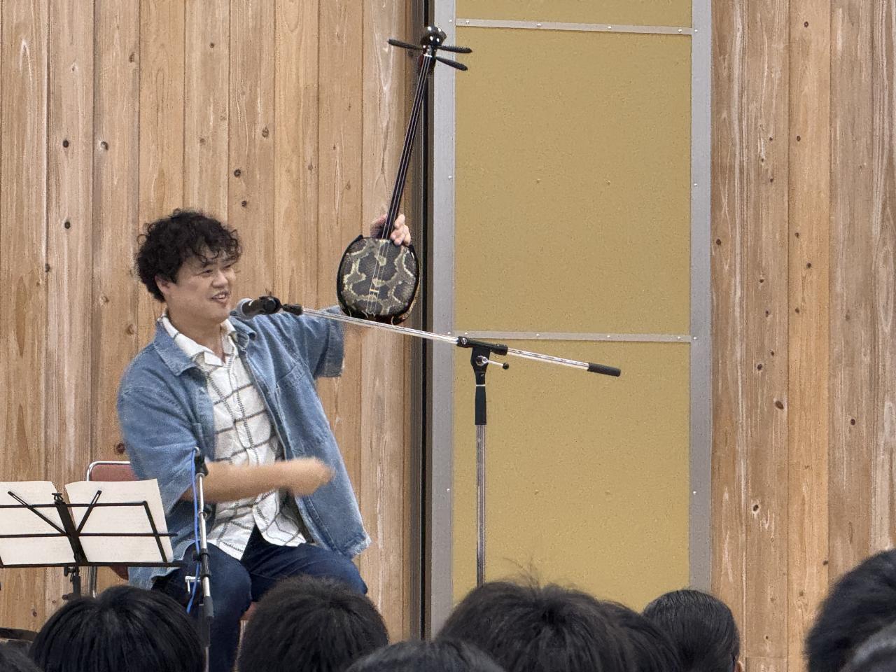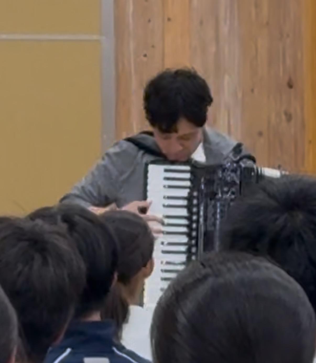 授業参観のあと、いざなぎアリーナにて教育講演会が行われ、「音楽で生徒の笑顔を」ということでウクレレとアコーディオンによるコンサートを楽しみました。KYAS(キャス)さんの奏でるウクレレは音色がとても明るく多彩。秦コータローさんのピアノとアコーディオンは実に躍動的!生徒たちはあっという間に音楽に引き込まれ、手拍子をしたり、ともに歌ったり、「イーヤーサッサァ~」と合いの手を入れたりと、楽しさいっぱいのひとときとなりました。(この行事はPTAの総務委員会が中心となって実施いただいたものです。素晴らしい企画に深く感謝申し上げます。)