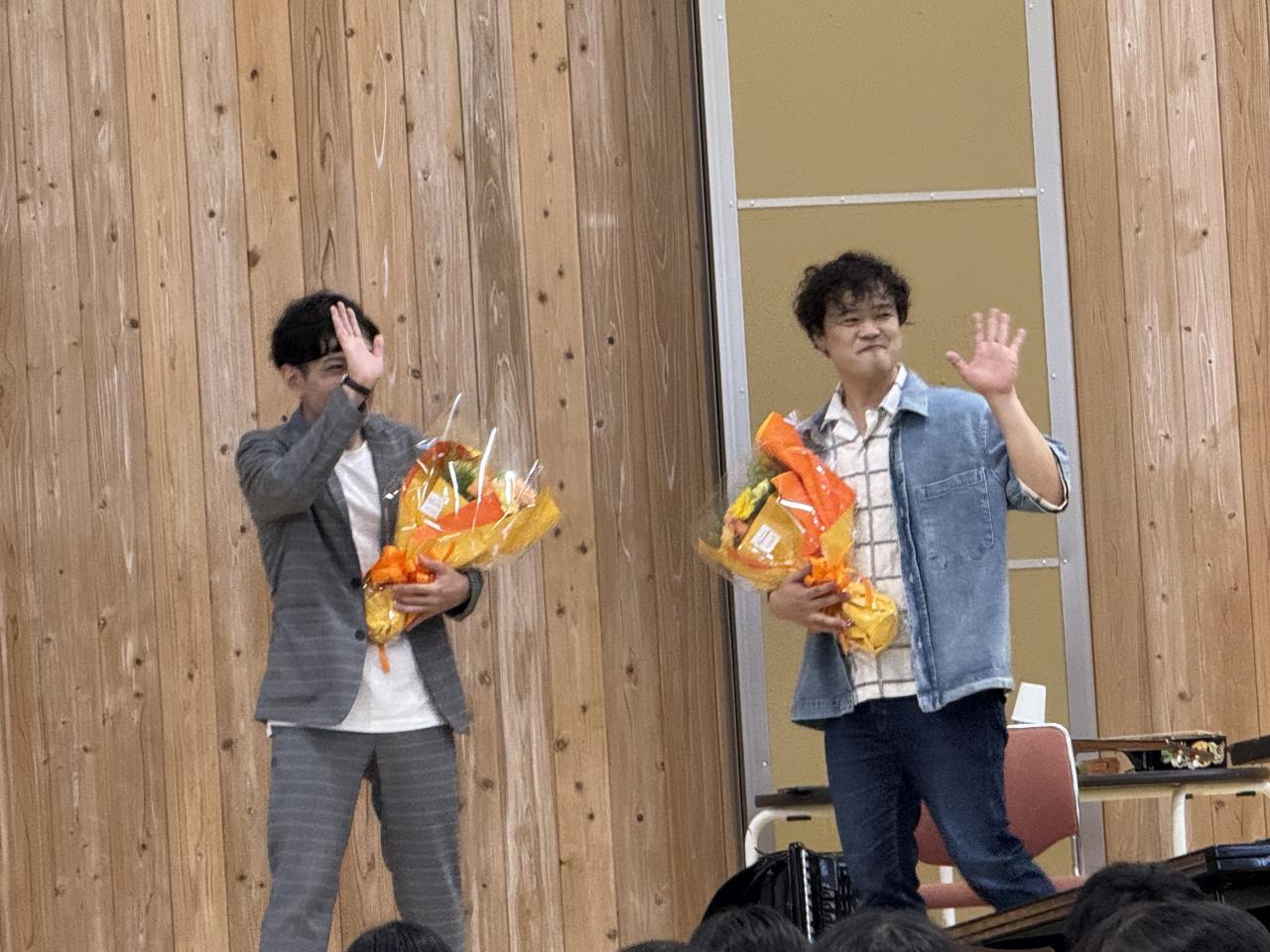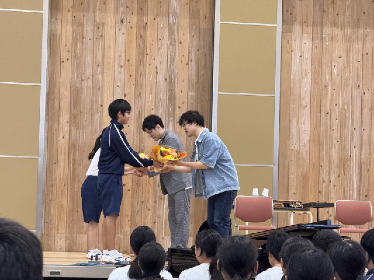 KYASさんからは、中学生に向けたメッセージもたくさんいただきました。”好きなことをやることは、人間を変える” ”周りの人が楽しくなることが、自分の存在価値だと思う。みなさんも。”などなど。生徒たちの心に大いに響いたのではないかと感じています。 秦コータローさんのトークは非常に巧みで、生徒たちの心をグッとひきつける魅力がありました。KYASさん、秦さん、本当にありがとうございました。