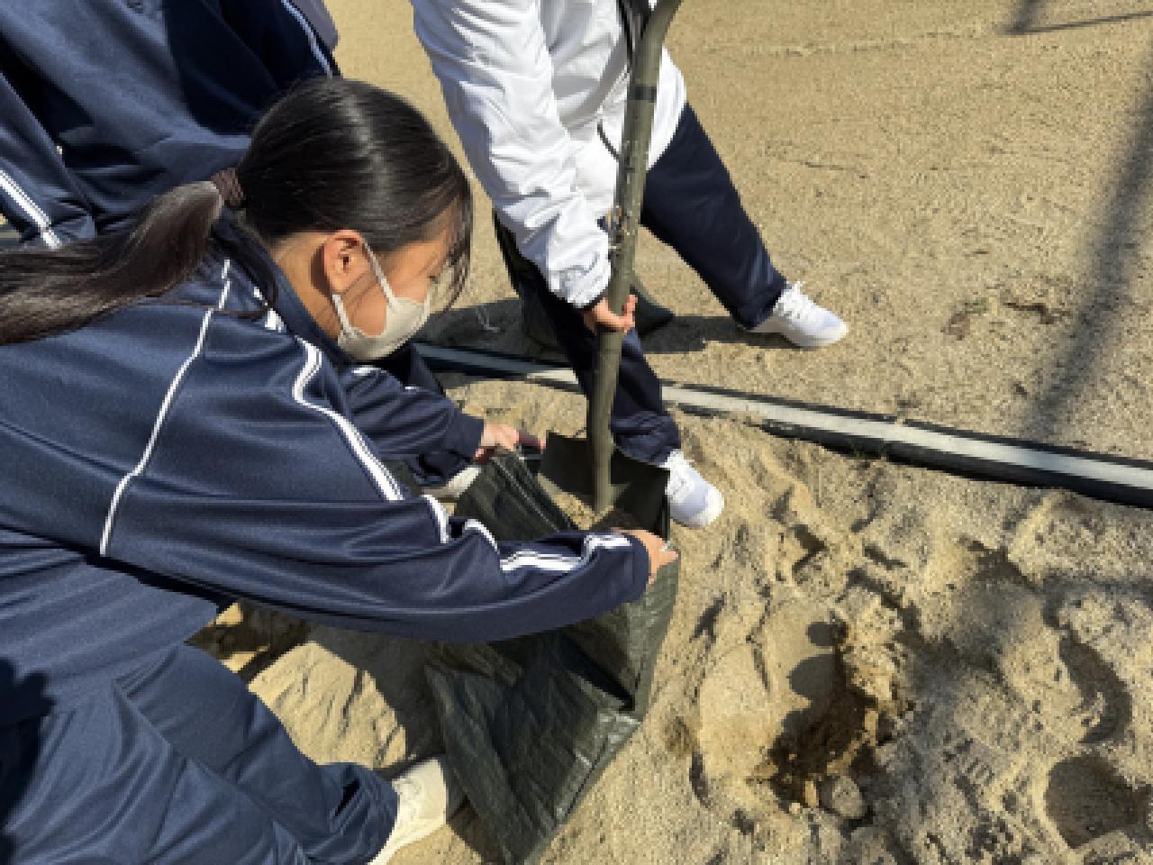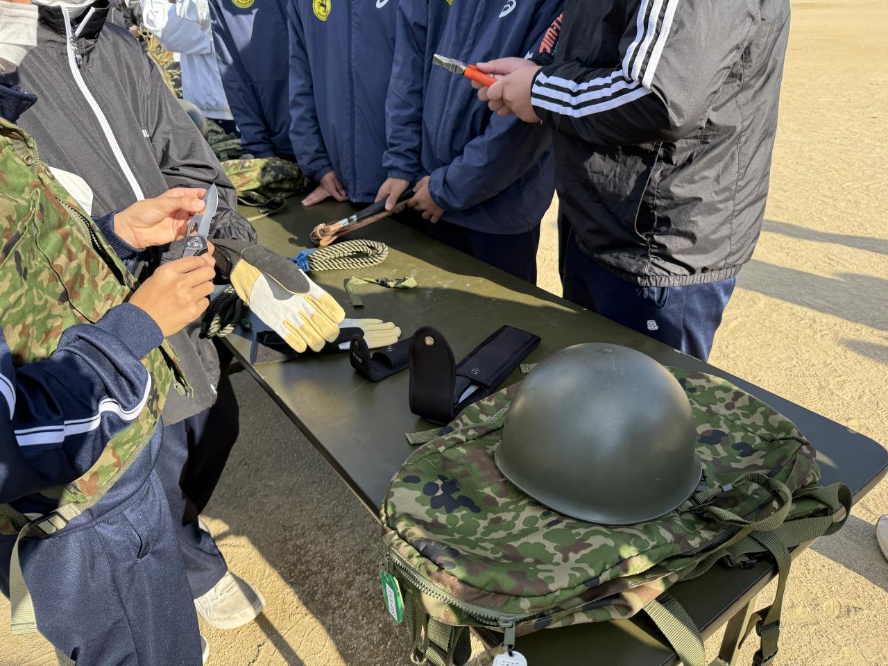 阪神淡路大震災から次の1月で30年目という大きな節目を迎えます。生徒たちの心に残る学びとするために、自衛隊の出張講座を活用して体験をしながら学ぶプログラムに。先に体験コーナーの様子をお伝えします。生徒たちは学年混合の4つのグループに分かれて、土嚢づくり、ロープワーク、人命救助システム、応急担架を体験しました。生徒たちは本格的な自衛隊の装備品を見たり触ったり、あるいは、応急的な担架を組むには?土嚢とは?ロープをくくるのはどうやってるの?など、興味津々に感じつつ積極的に活動していました。自衛隊の方から、「日頃何気なく使えているものが使えなくなる → 備えが必要だよ!」と教えていただきました。