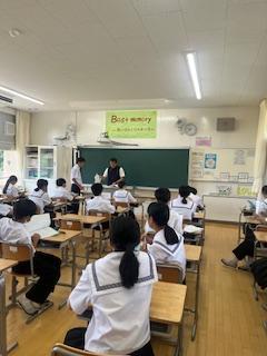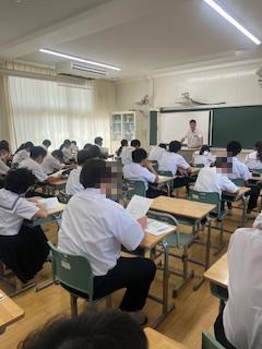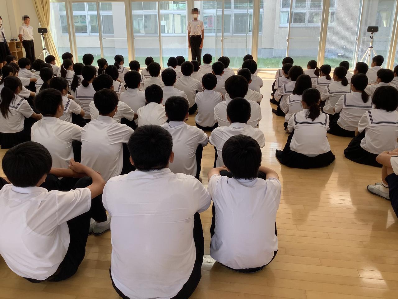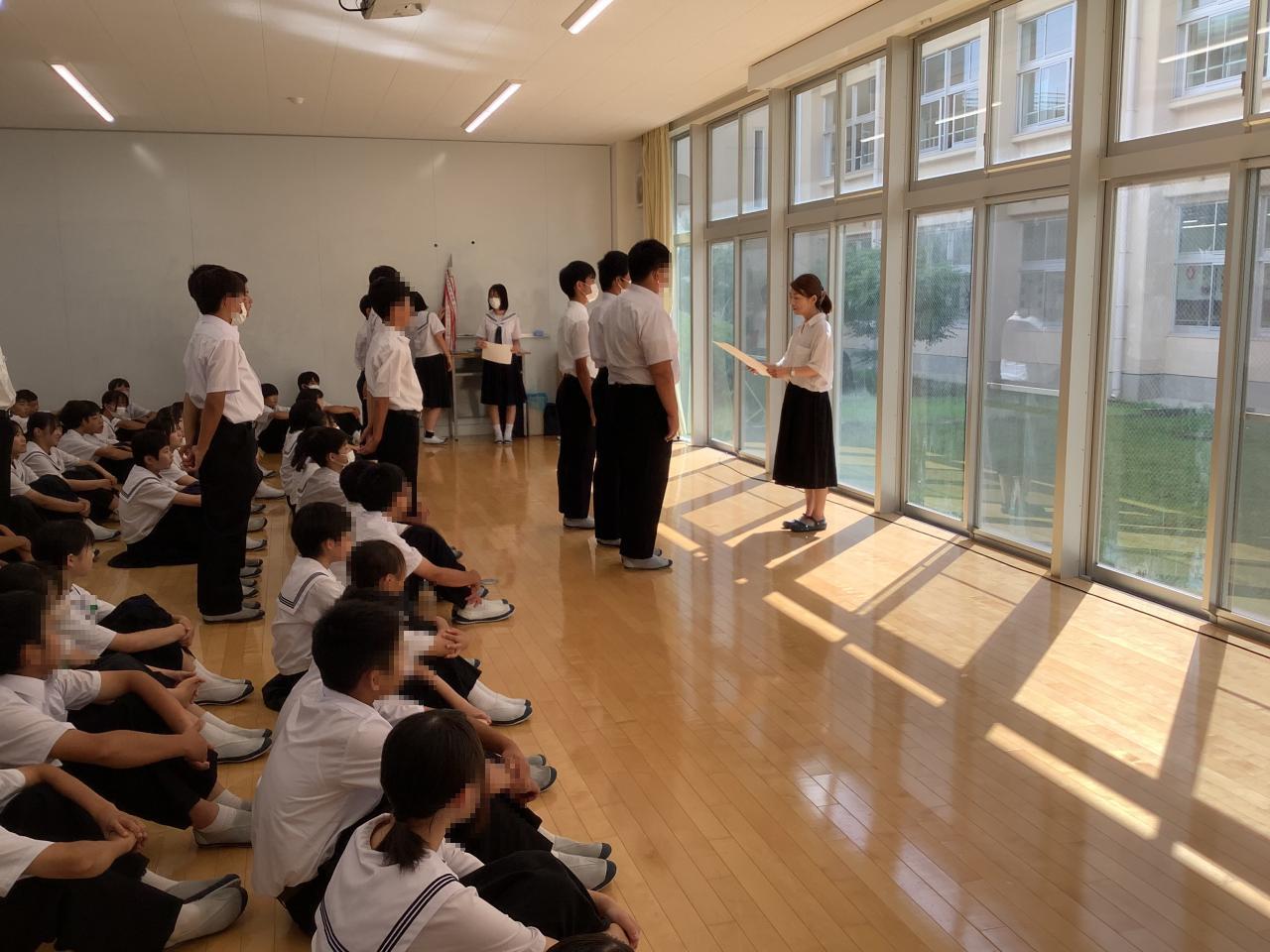 終業式では校長から①せっかくの機会を生かして何かチャレンジを②2学期に向けてしっかり準備を!③健康管理して9月1日、この場所で元気に集まってくださいと伝えました。その後、全校集会で生徒会からは「生活のきまり」の一部見直しについてのアンケート結果を全校生に知らせ、よりよい学校にしていきましょうとの呼びかけがありました。